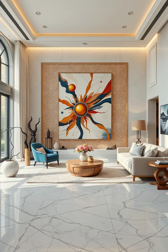 In the future, 2026, a statement art piece cannot be done without in luxury living rooms. At least my personal interpretation of art is that it is the soul of the interior, it is one that establishes the emotional mood and personality. It could be an abstract art piece or a sculptural installation, or even a commissioned mural: the correct art piece immediately determines the nature of the space.