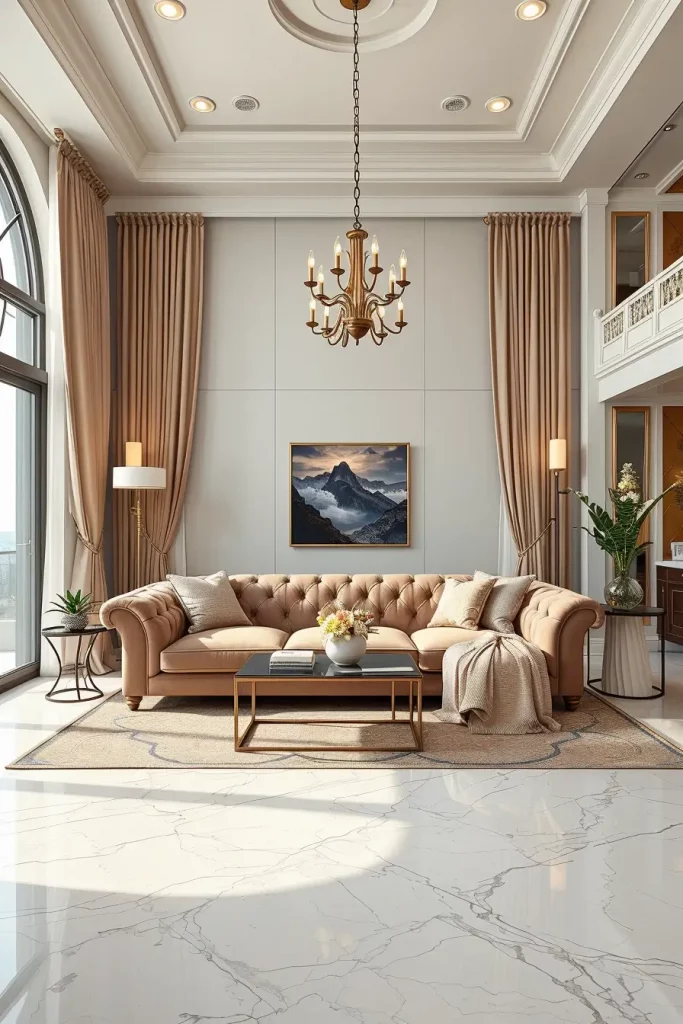 Any luxury living room begins with a magnificent entrance to the world of splendor, where the guests are welcomed. I will always start imagining an open foyer that flows smoothly to the main lounge area, characterized by symmetry, proportion and texture. The sculptural chandeliers used in high ceilings produce an instant impression, and the flooring is polished stone that reflects natural lighting and gives an impression of light and welcoming atmosphere.