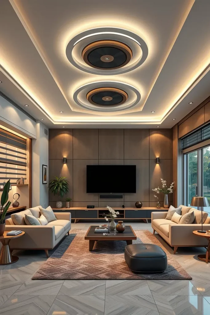 Proportion and integration are some of the considerations I make when designing such ceilings. The lighting grid is recessed, and does not overload the scene, and metallic inlays or wooden slats are used to bring in the warmth. The curved forms on the ceiling have also been echoed by organic forms in the trends in furniture, which have united the design.