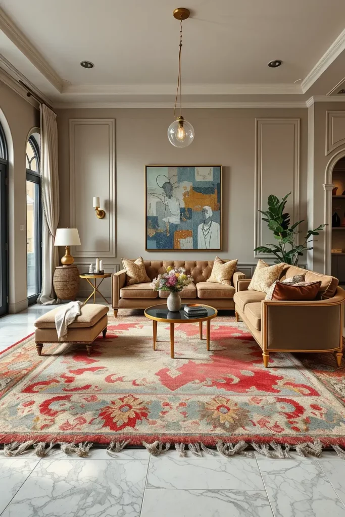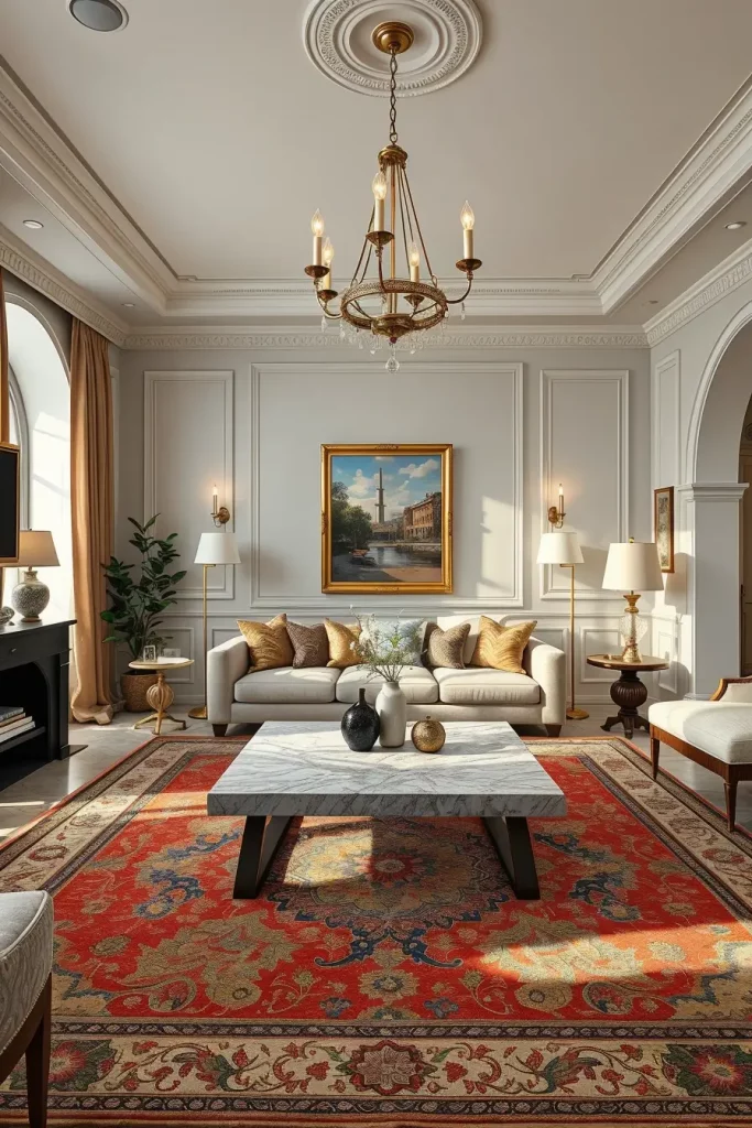 An example would be combining an old Persian rug with a modern marble coffee table to bring out the element of balance that is lived-in yet classy. The aesthetics is held together with the addition of bronze floor lamps, framed abstract art or contemporary chandeliers. I think that this mixture welcomes sophistication without the stinging of excessive theming of the interior design.