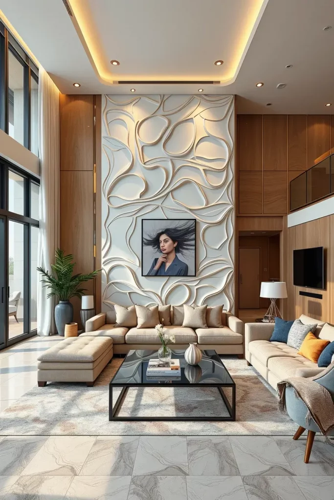 To fit into these types of panels, I normally combine low profile sofas, glass coffee tables and directional lighting which reflects every curve and relief. The neutral colors such as sand, graphite and ivory are combined to create the impression of architectural depth. It is a design that will make a normal wall a conversation piece.