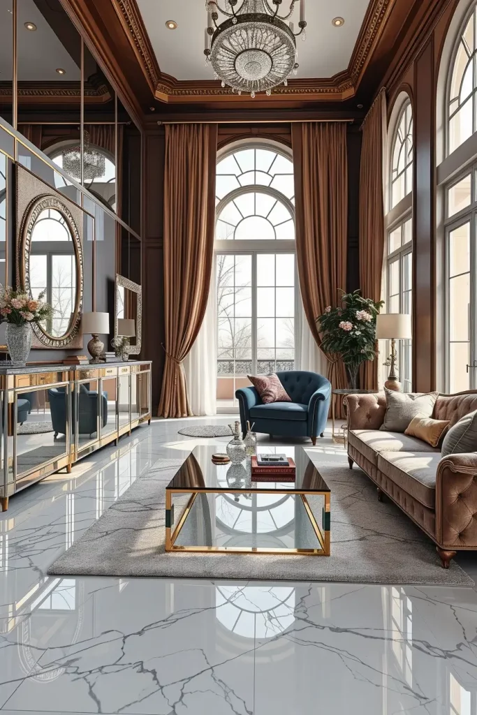 In planning, I would frequently combine mirrors with a bronze stain with polished chrome or smoked glass, and it has a refined and layer effect. They can be complemented by velvet seating and marble floors to achieve a high level of balance of textures. Opposite windows have mirrors that help in the expansion of the space in addition to highlighting symmetry.