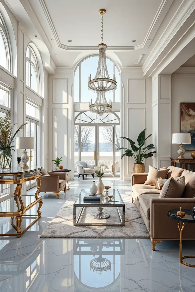 Although signature details like unique console tables, decorative mirrors, and selected artwork create the luxurious ambience even before the guests enter the living room. I always like to combine such architectural elements as archways, columns, or paneled walls to provide structure and depth. The elegance of the continuity of the entrance and the living room will be guaranteed by the combination of brass accents and soft ambient lighting.