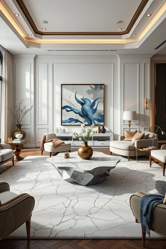 Large-scale artwork is one of the first design features that I associate with living room luxurious life when I consider luxury living room ideas. Large works of art automatically draw the attention of the observer, creating the atmosphere of the whole space. Designers prefer vibrant canvases in abstract or minimalist arrangements that bring color, verve, and personality in rooms in 2026. These pieces of artwork assist in forming a center of focus without overcrowding the design, introducing some form of personality to indicate the taste and the lifestyle of the homeowner.