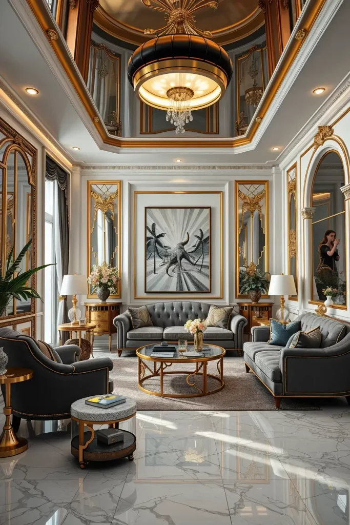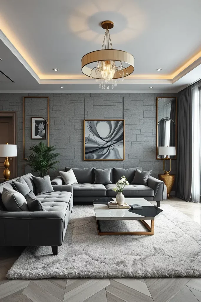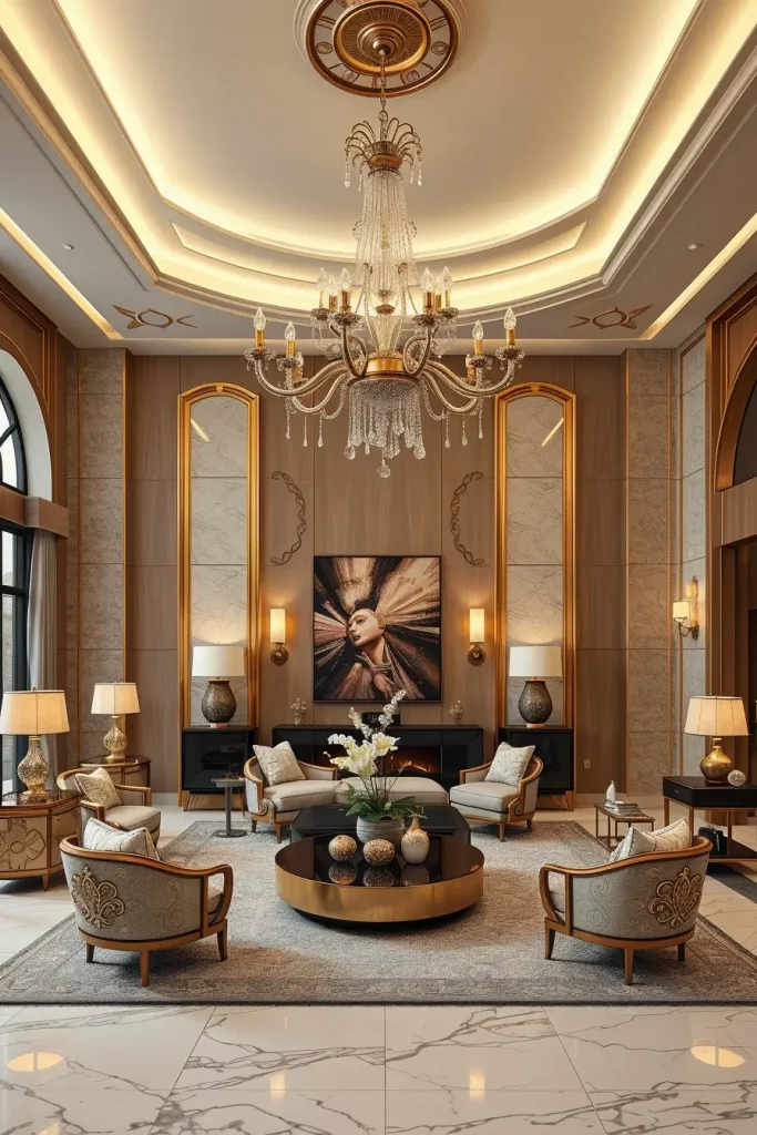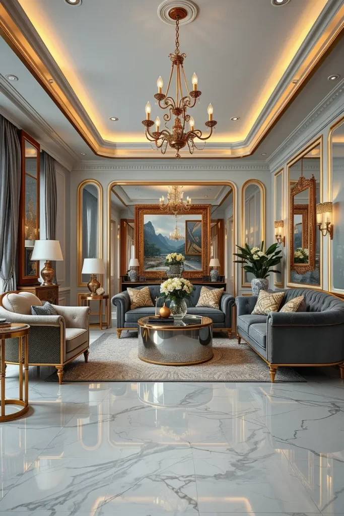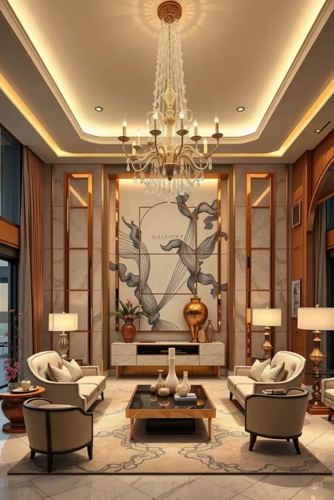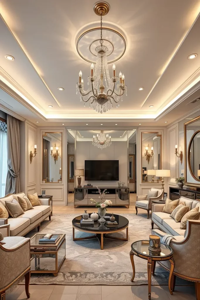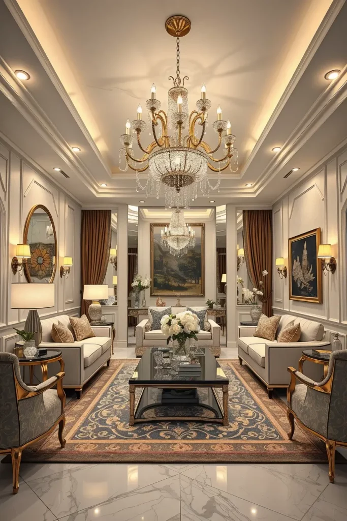 I would prefer statement chandeliers, wall sconces and recessed LED strips when it comes to designing lighting. Such layers guarantee a variety of applications – high light during celebrations and low lights during rest. The use of metallic finishes, glass fixtures and crystal pendants are luxurious yet do not flood the eye. I also note the effect of reflective surfaces, e.g. the mirrored furniture or the lacquered finish, which increase the amount of reflection of the light in the room.