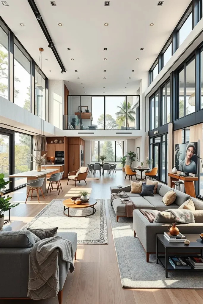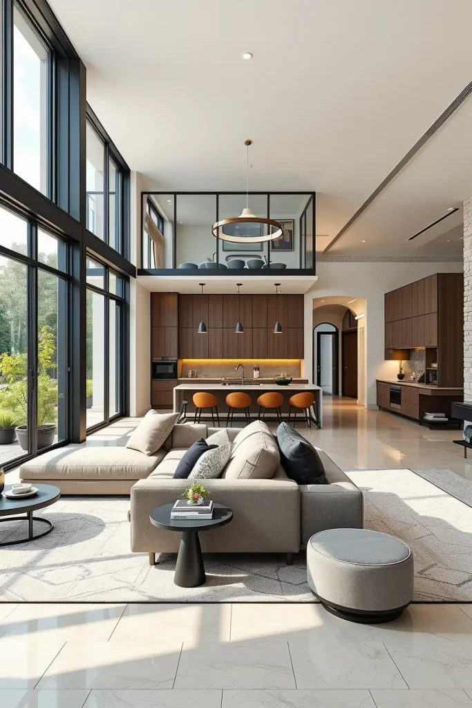 In order to create a balance in open-plan living I would suggest delineating the spaces with area carpets, statement lighting or low profile furniture that will not block sightline but still differentiates the areas. The layout is anchored with sectional sofas, glass partitions, and accent chairs to maintain the design. Such surfaces as porcelain slabs, smoked glass, and matte brass add a sophisticated touch to it.