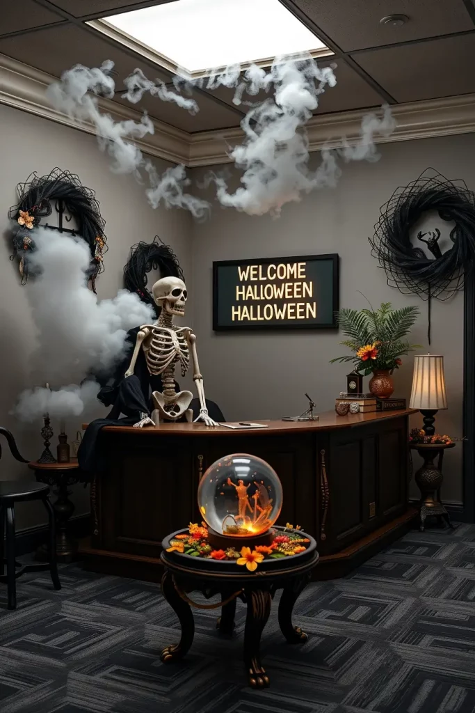 Begin with a skeleton or ghost greeter, fake cobwebs on the desk counter and illuminated signage that shows a Halloween message. I adore clear apothecary jars with candy eyeballs, creepy office flyers with gothic fonts and a fog machine secretly placed in a planter to create unexpected atmosphere. The picture is completed by black feather wreaths on nearby walls.