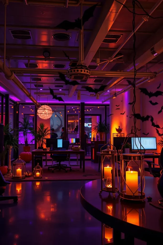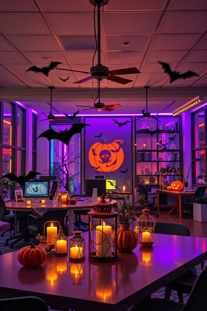 Cube the line cubicle with orange rope lights, backlight the plants with purple uplighting, and use LED candles in lanterns to provide glowing without fire risk. Monitors with light strips behind them or under desks create a haunted technology look. Ceiling LED projectors are capable of projecting moving webs of spiders, bats or misty shadows in the room.