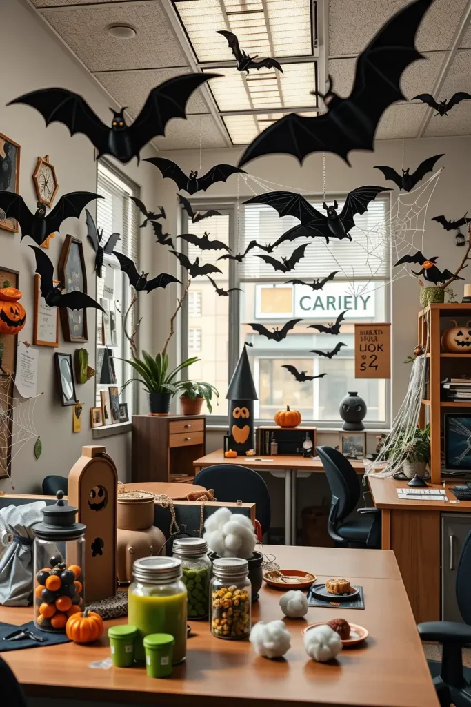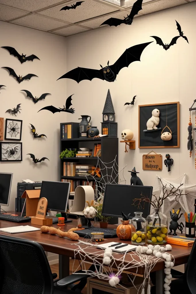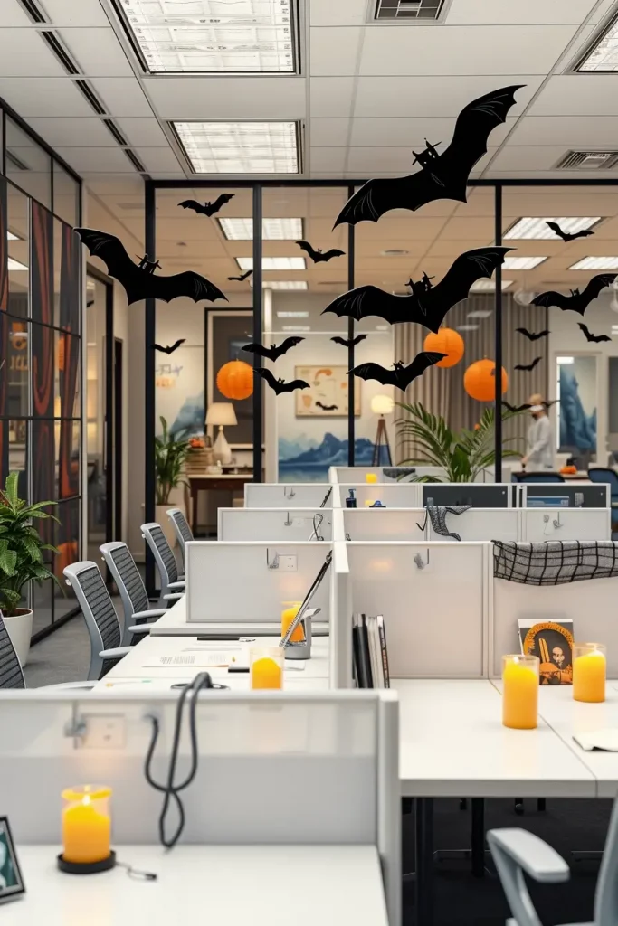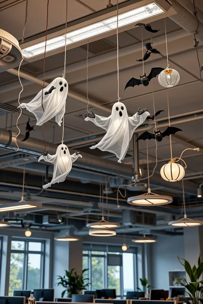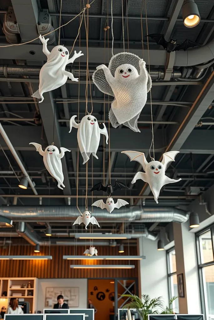 Whenever I desire to give Halloween office decor some vertical dimension, I never fail to include floating ghosts and hanging bats. These features attract the attention upwards and the whole room seems to have been transformed without occupying the precious floor space. Suspended decorations provide drama in an open-plan office or shared working spaces, without disrupting the flow. The secret is to employ lightweight and safe materials and make sure that all hanging parts are firmly fixed.