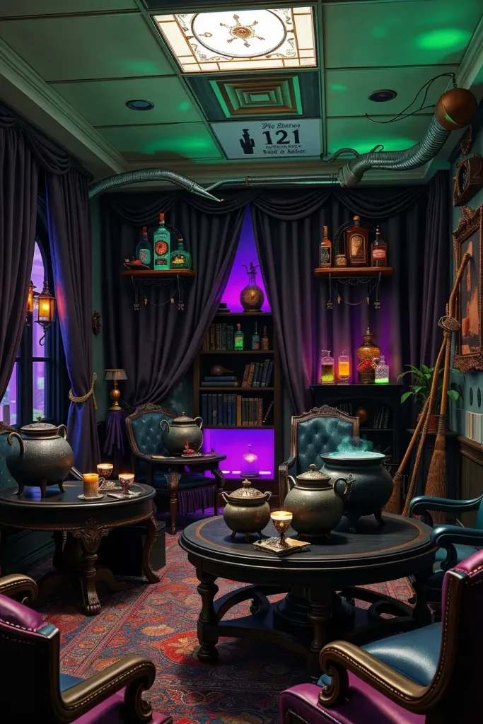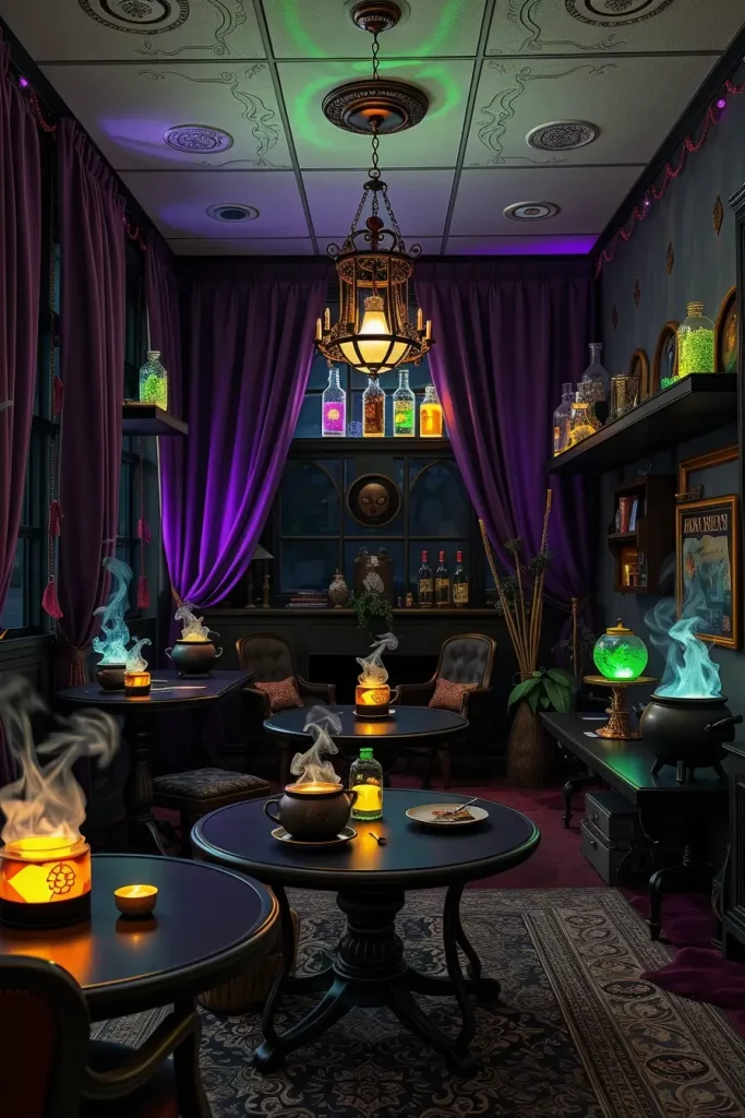 Cover eating surfaces with a dark tablecloth, use bubbling cauldron centerpieces and floating bottles of potion with the help of transparent shelves. Add black-and-gold mugs, witch hat wall hooks and spooky menu boards to get that magical feel. I am also fond of layering with faux moss, spell scrolls, and wooden broomsticks propped against corners. Use a darker color scheme- black, green and amethyst can be used with wood and chrome.