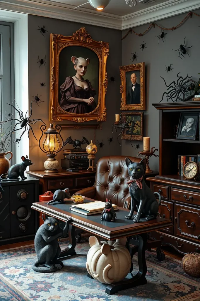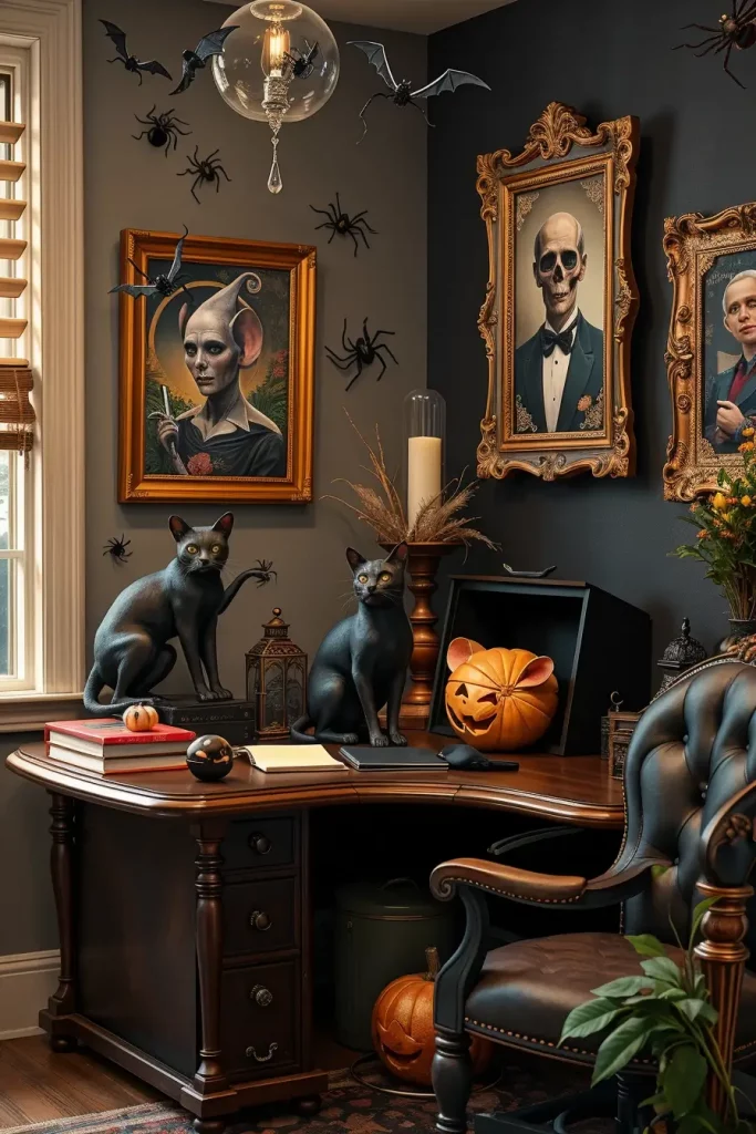 Put plush or ceramic black cats on the floor plants or on the window sills. Include some realistic faux mice, small spiders, and insect decals crawling out of rugs or around the legs of desks. I also like to add the cat eyes that glow with LED dots and creepy cat portraits in gold frames to add some surprise. These facts form a realistic atmosphere that is not too dangerous to work with and does not interfere with everyday life.