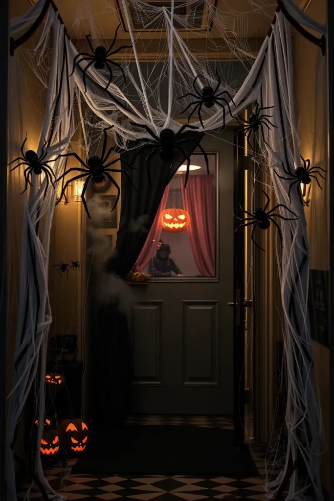 Apply extra-thick stretchy webbing, oversized spider props and black draping fabric on door frames. Add glowing red eyes, motion sensors and a fake spider egg sac hanging just a little overhead to add thrill factor. You can even stick a warning sign on the door that reads, infestation zone. Ensure that all is safe, particularly in busy places.