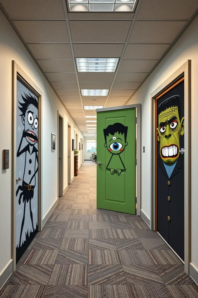 In my experience, I like to use adhesive vinyl door wraps that don’t leave residue. I like to use foam eyes, pipe cleaner tentacles, and attachable teeth to the door frame. For the HR or IT departments, I suggest designated characters like a vampire biting a resume for HR or Frankenstein rebooting a server for IT. These give some customization to the design without too much hassle.