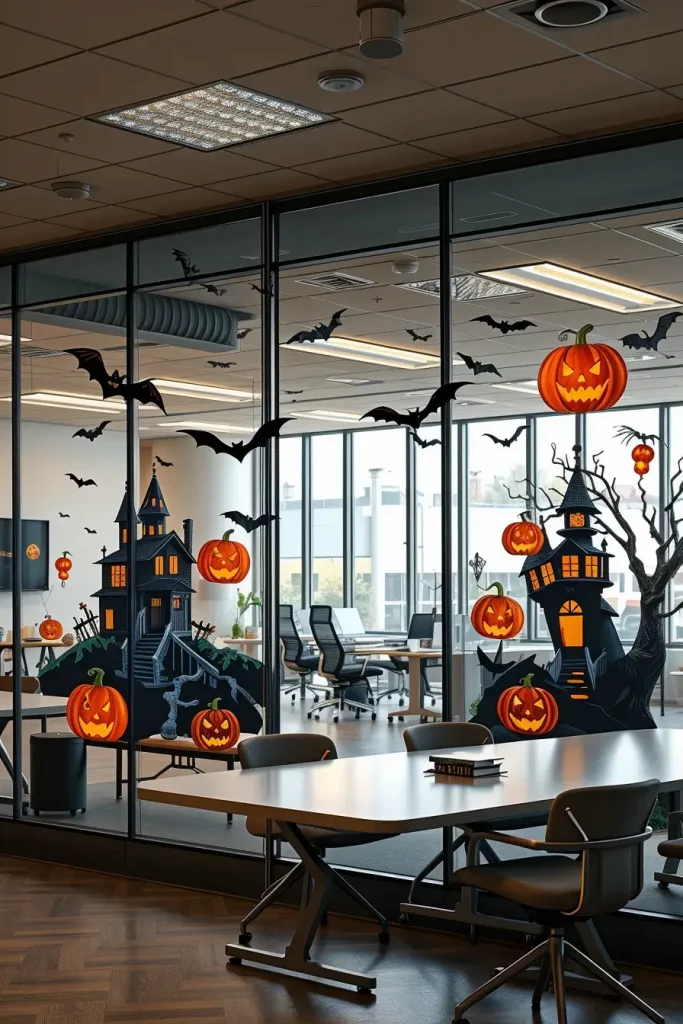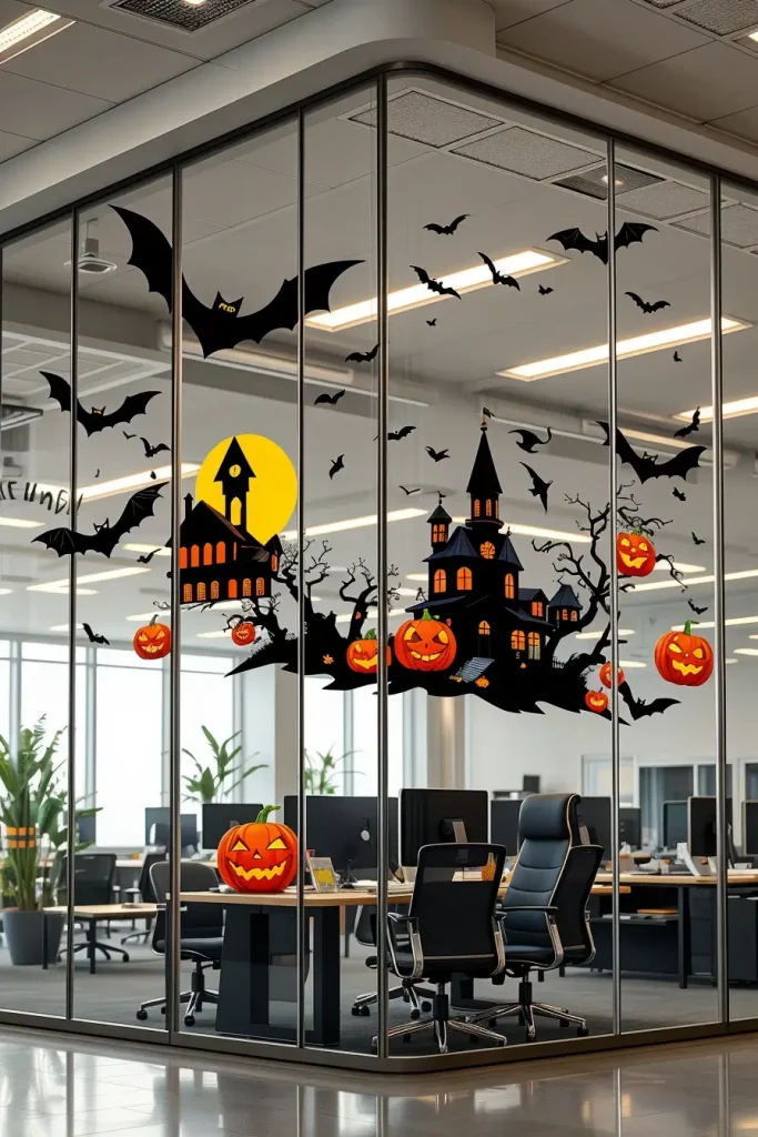 I usually have large scale vinyl clings made with bats, haunted mansions, ghosts, and spider webs. For teams that are more playful, face expressive pumpkins are a huge hit. They are perfect for the conference room windows, reception areas, and kitchen glass dividers. I love layering translucent and opaque finishes for more dimension.