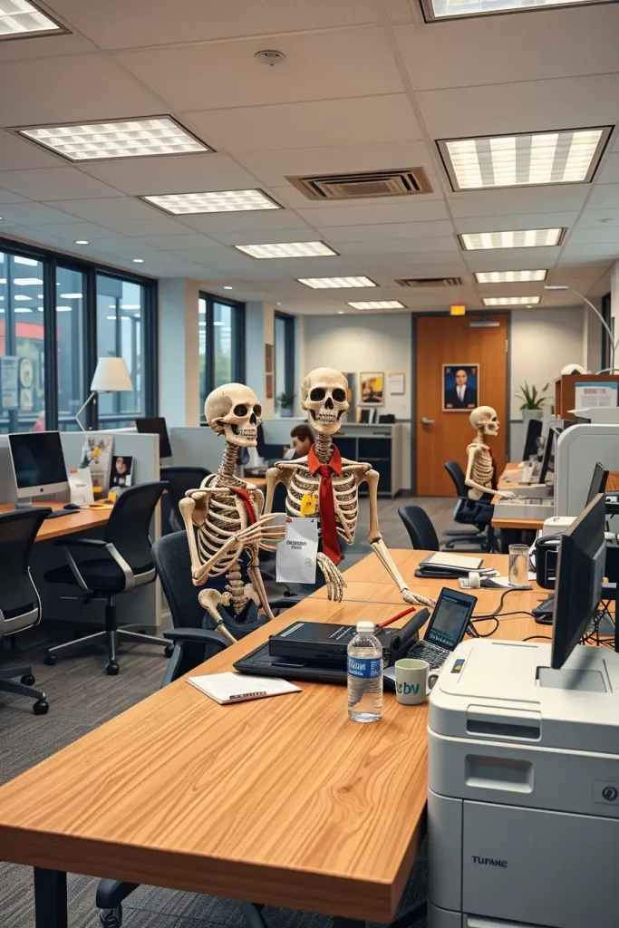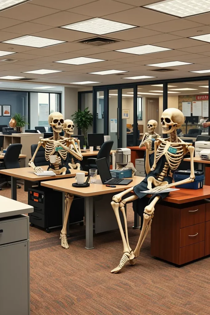 To take it a step further, I’d recommend placing a fake Slack message on each skeleton’s screen saying “Still waiting for vacation approval.” Instant modern office makeover.