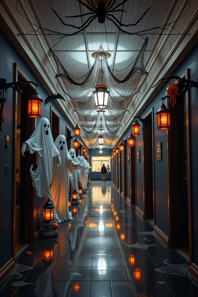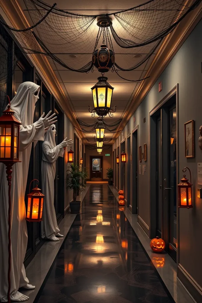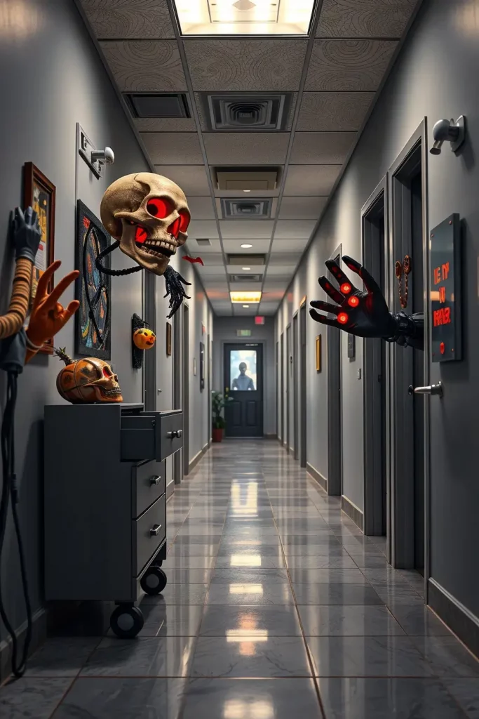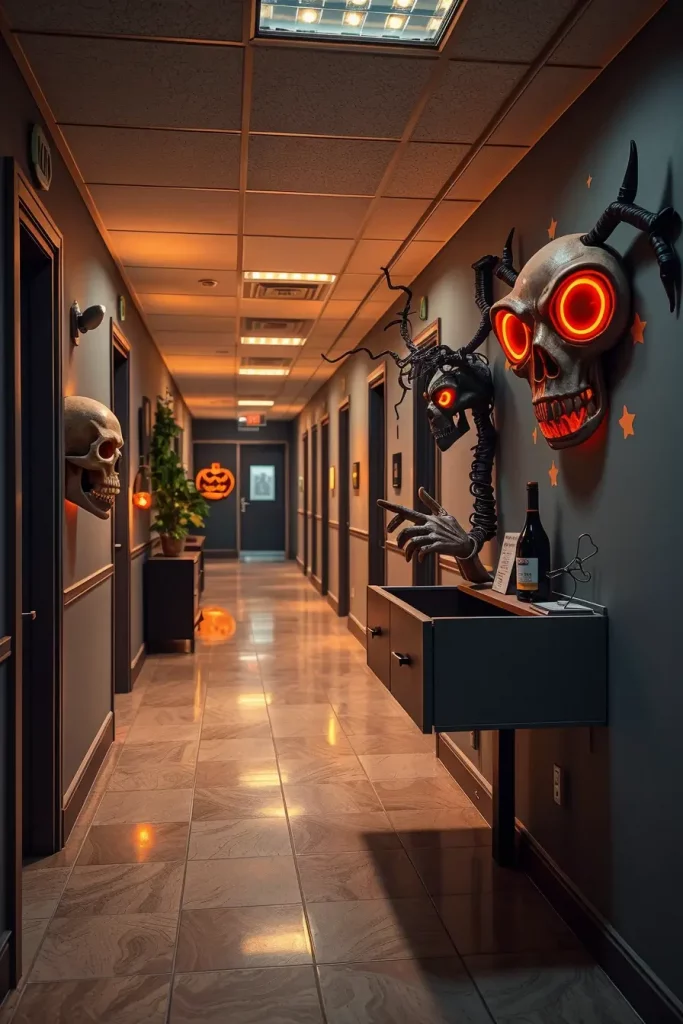 The hallways are the veins of the Halloween decor of your office, they dictate the mood. When creating designs of hallways, I always start with choosing the visuals that will give depth and foster curiosity. You would like to transform a boring corridor into a mini haunted maze but without hindering movement and making it unsafe. Tell stories with the help of wall sconces, dark silhouettes, and floor decals.
