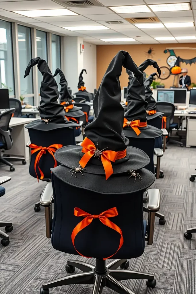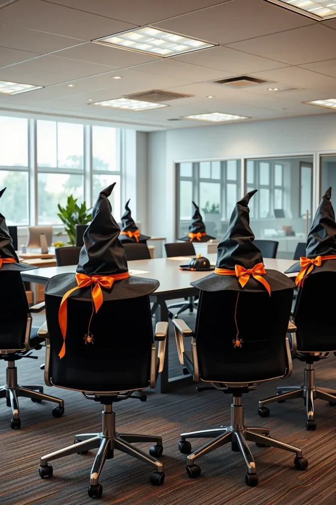 The most lovely office Halloween decorations can also be the most subtle ones. My all-time low-effort, high-reward idea is to put miniature witch hats on the back of all the desks or conference chairs. It immediately turns boring office into a fun coven of creativity without disturbing workstations and breaking any rules.