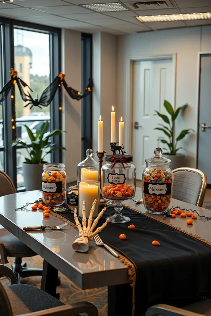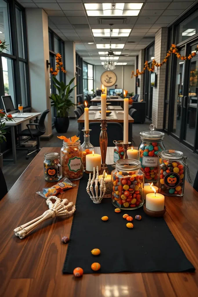 I am sure that every office decorated in Halloween must have a candy station, not any station, though. These sweet spots can be used as a spectacular centerpiece of the design with a bit of cleverness. Imagine apothecary-style jars, gothic trays and themed labels, which match the rest of your design. It is practical, celebratory, and sociable.