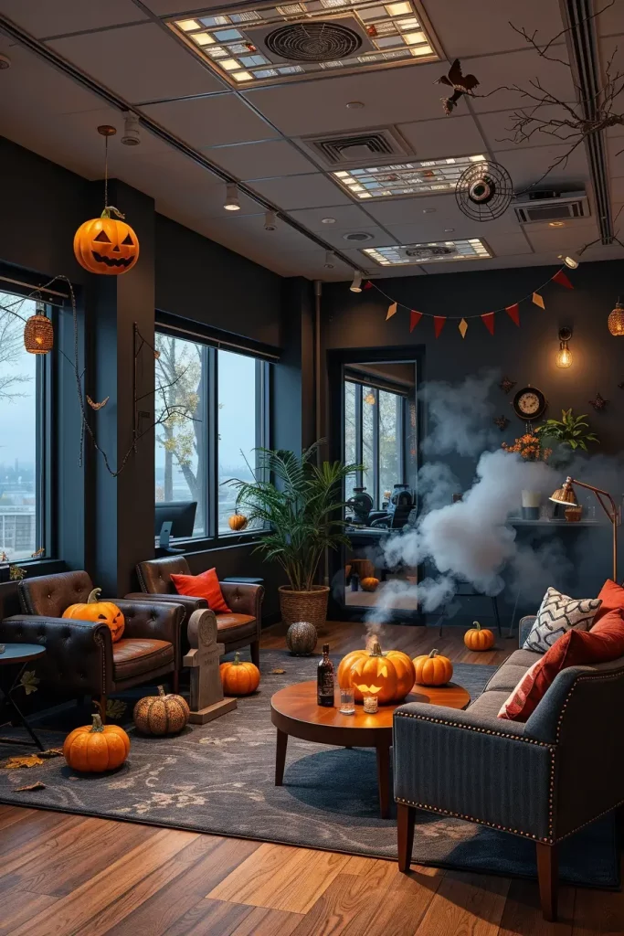 Most people do not pay much attention to the break room, but I believe that it is the best place to immerse in Halloween completely. I would suggest in 2025 to turn your staff lounge into a witch lair, with creepy potions, magical lighting, and antique-themed details. It is the right blend of entertainment and utility, and it lets employees have a magical break on their desks.