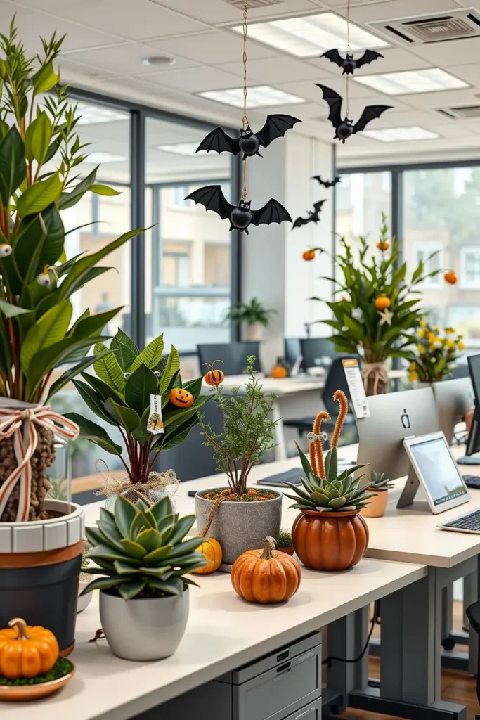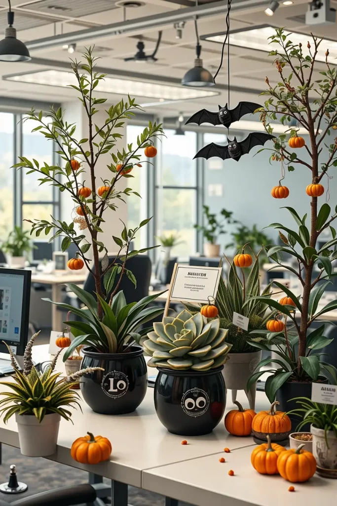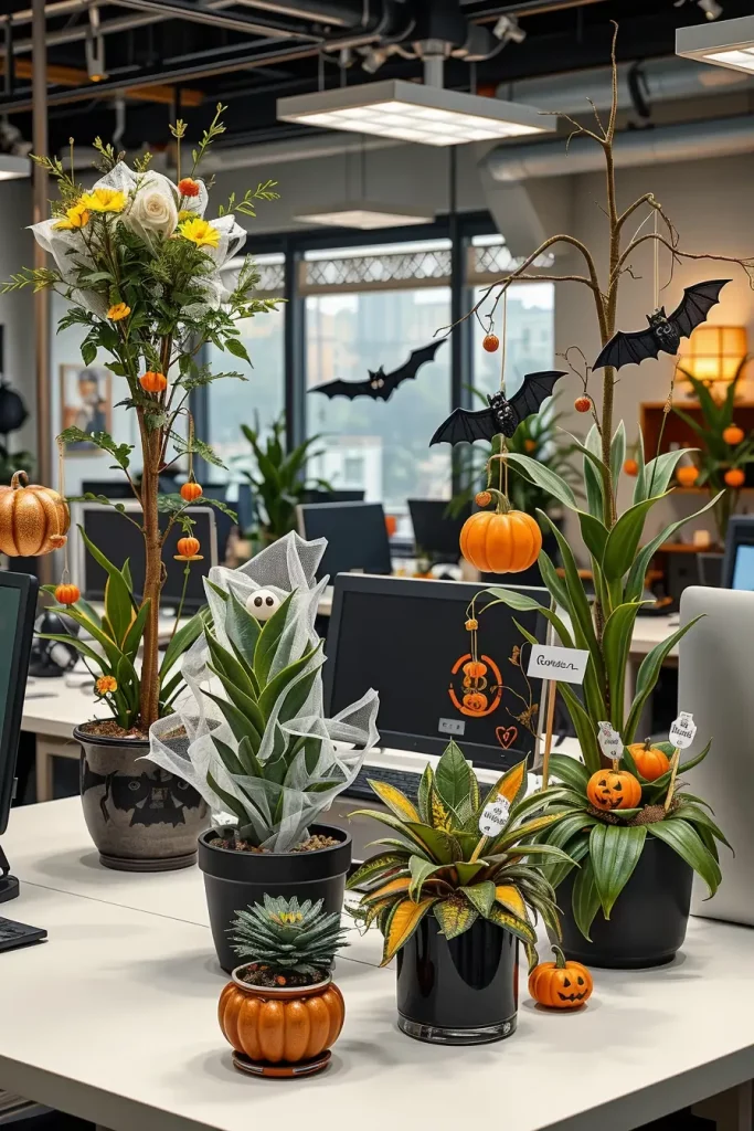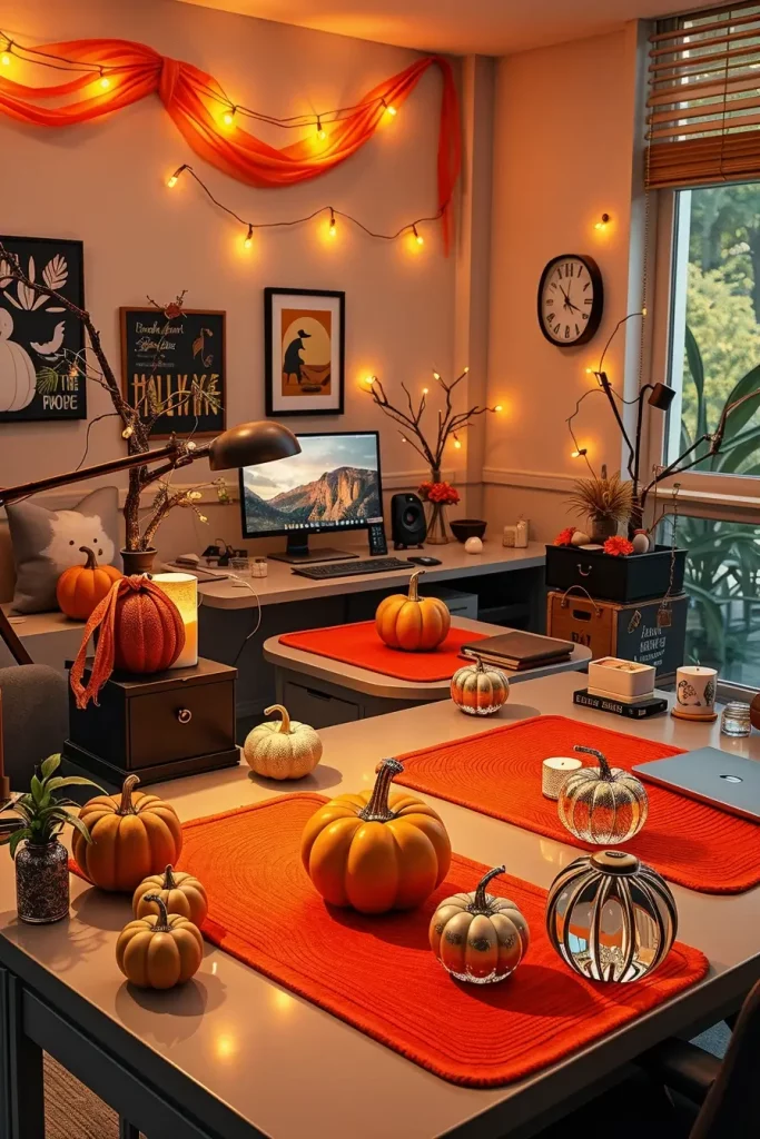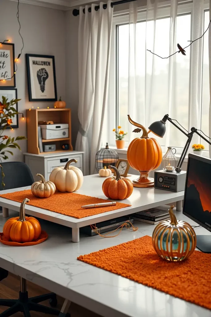 Pumpkins are a Halloween staple, and they are actually quite adaptable in the workplace. I tend to recommend a simple, yet multilayered style, i.e., the use of various sizes, textures, and materials to avoid visual boredom. A less-than-intimidating method of engaging in Halloween is to include pumpkin-themed desk decor, which does not overload your work environment.