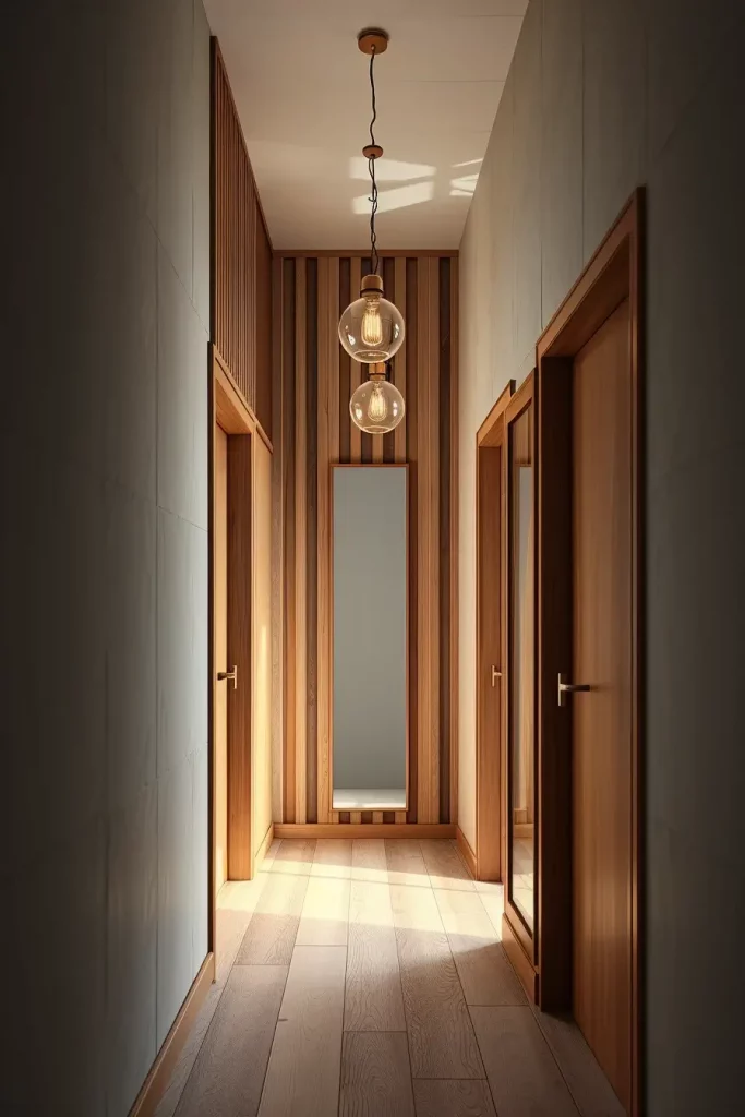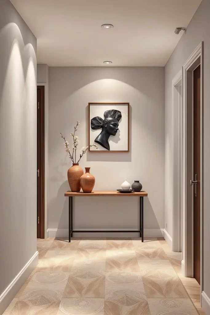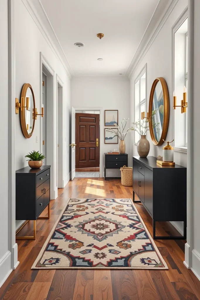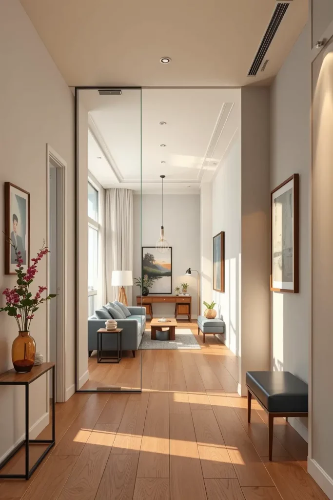Whenever an entryway is not very wide, I choose to bring in reflective surfaces to reflect light and give the impression of additional space. What works best for me are large mirrors Framed in metal or wood so they blend with the room’s look. When you hang a mirror across from the main door or window, it fairly doubles how bright the hallway feels.