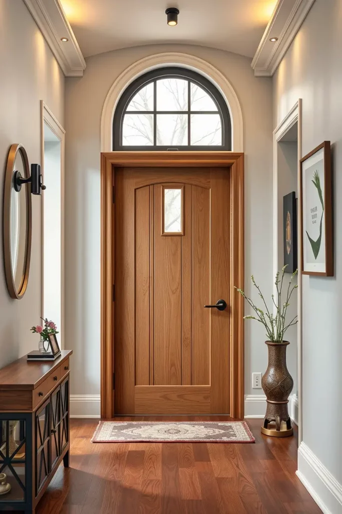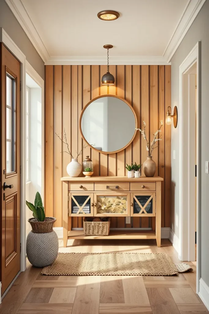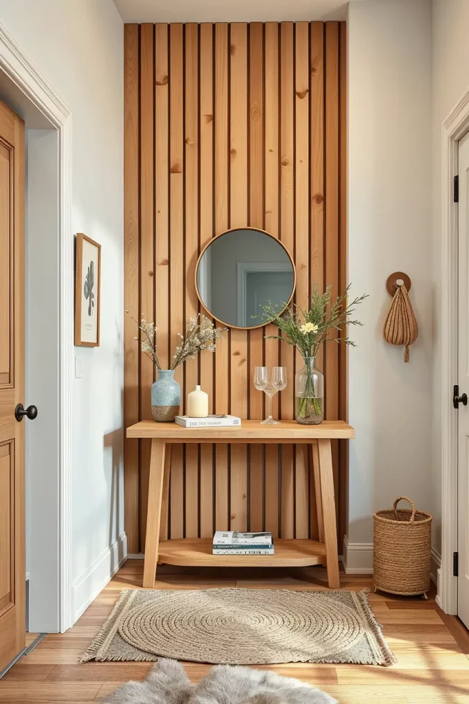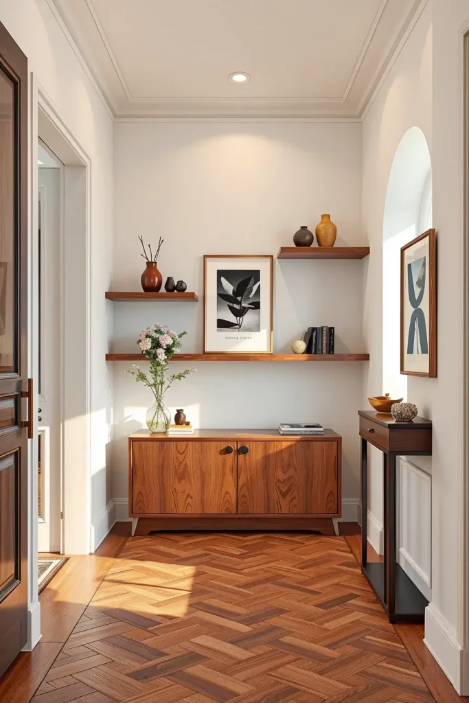 Wood always stays a common choice, mainly when you need to make a small entryway cozier. Because organic wood tones, from oak to walnut, add texture and a classic impression to small entryways, I’m always drawn to them. Wherever it appears—in panels, on floors or in pieces of furniture—wood makes rooms more cozy by softening hard edges.