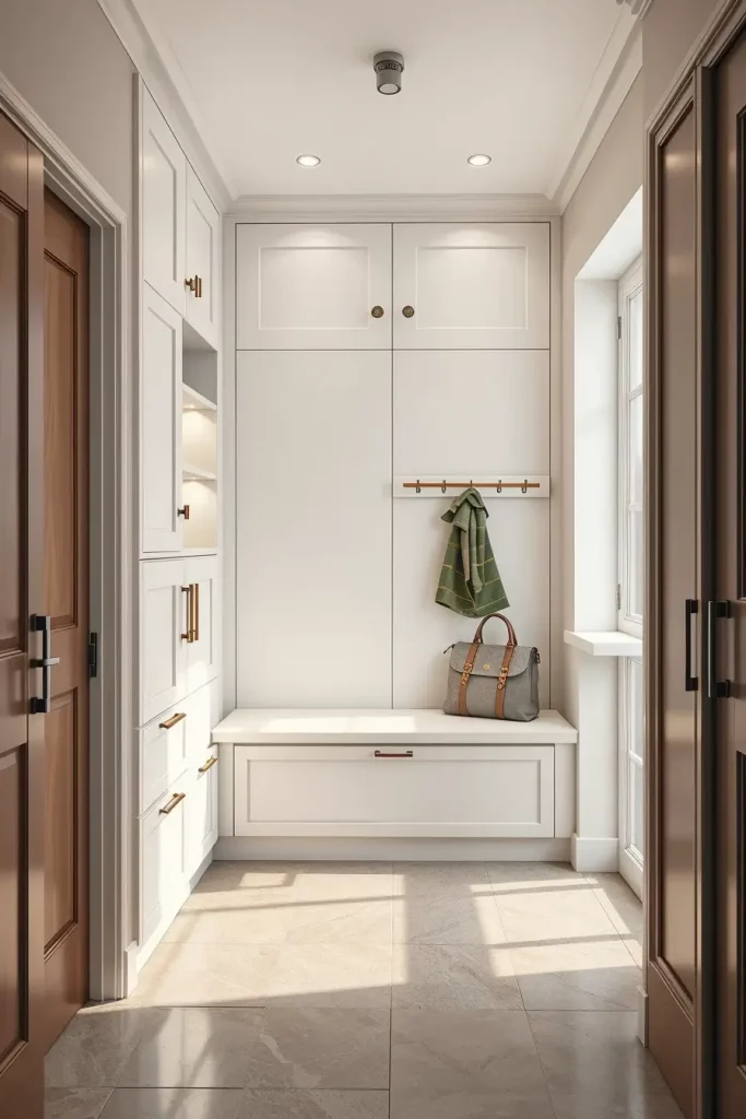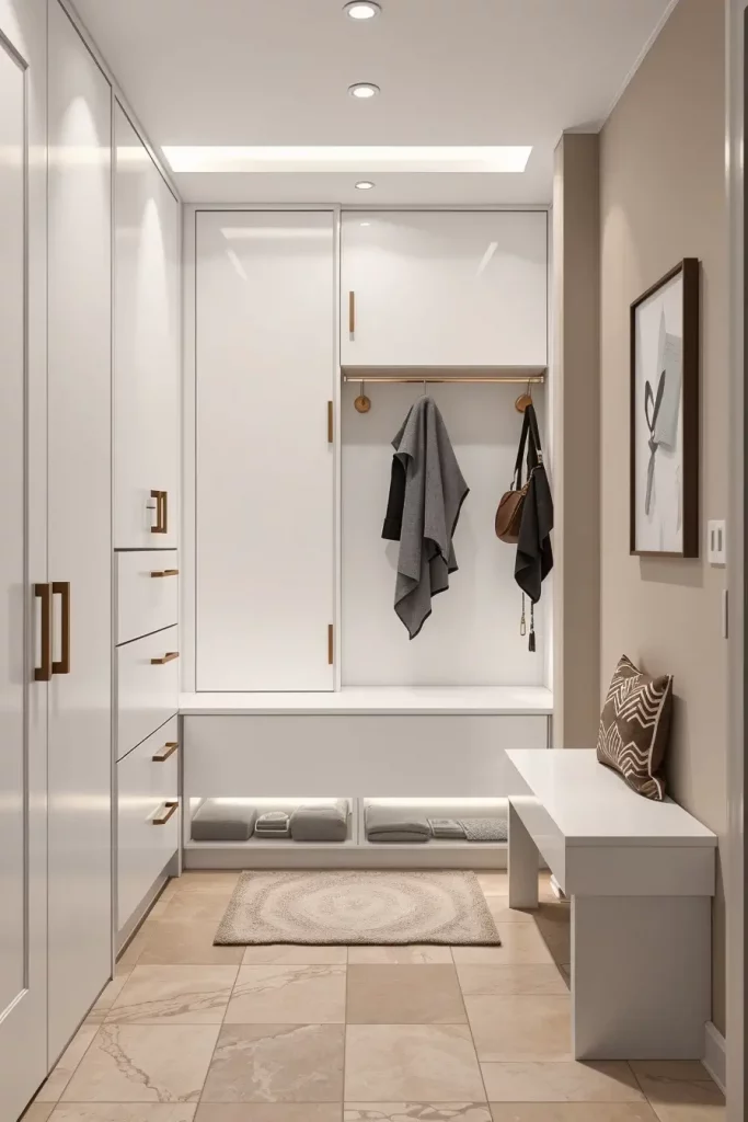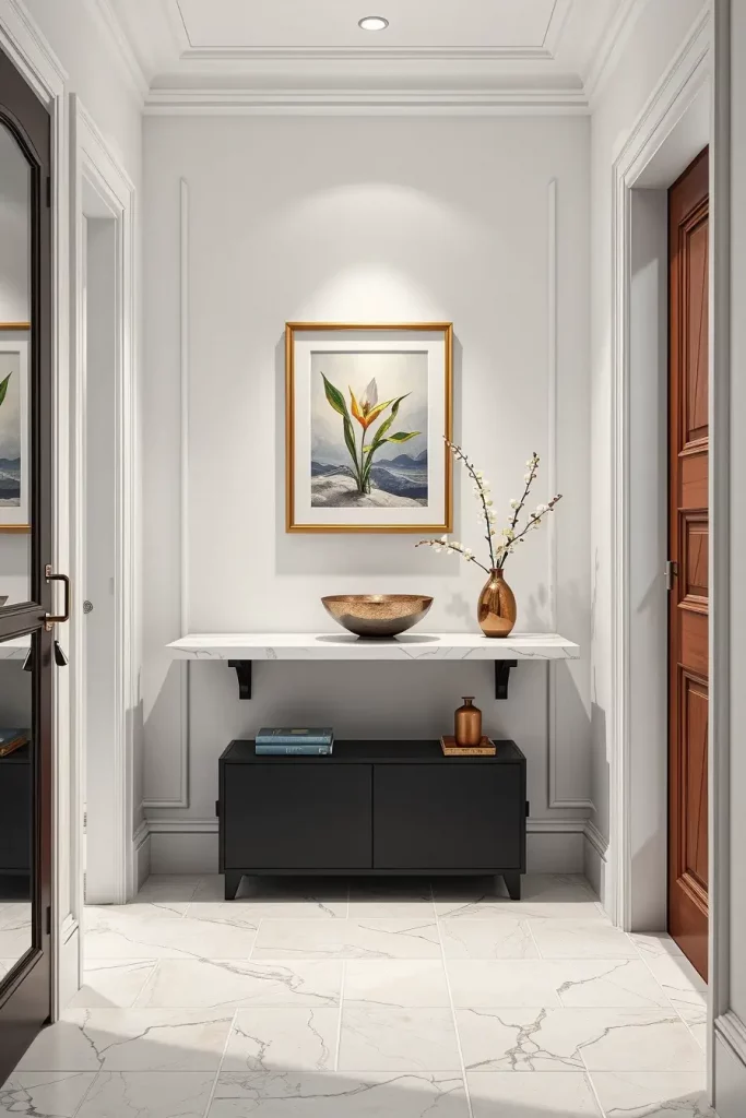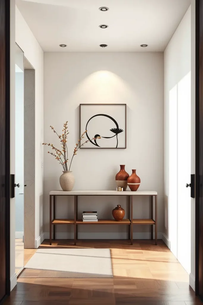 An instant way to add modern touches and light to small entryways is with accessories made of metal. I believe that using reflective materials like brushed gold or chrome can really brighten up a narrow entrance hall. By using this strategy, architects can bring clean, organised style to minimalist construction.