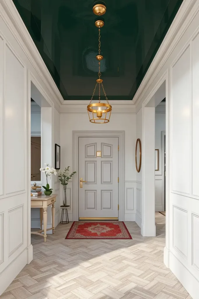 For one project, I coated the ceiling in a deep, shiny aubergine that gave the narrow front a unique, elegant focus. According to designer Miles Redd, “A lacquered room is what grown-ups use to add sparkle.” That same approach is suitable for entrance halls.