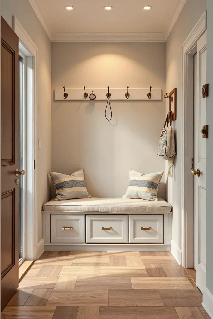 I’d suggest putting up some wall hooks over the bench or close to it, so you can hang coats and bags when you get home.