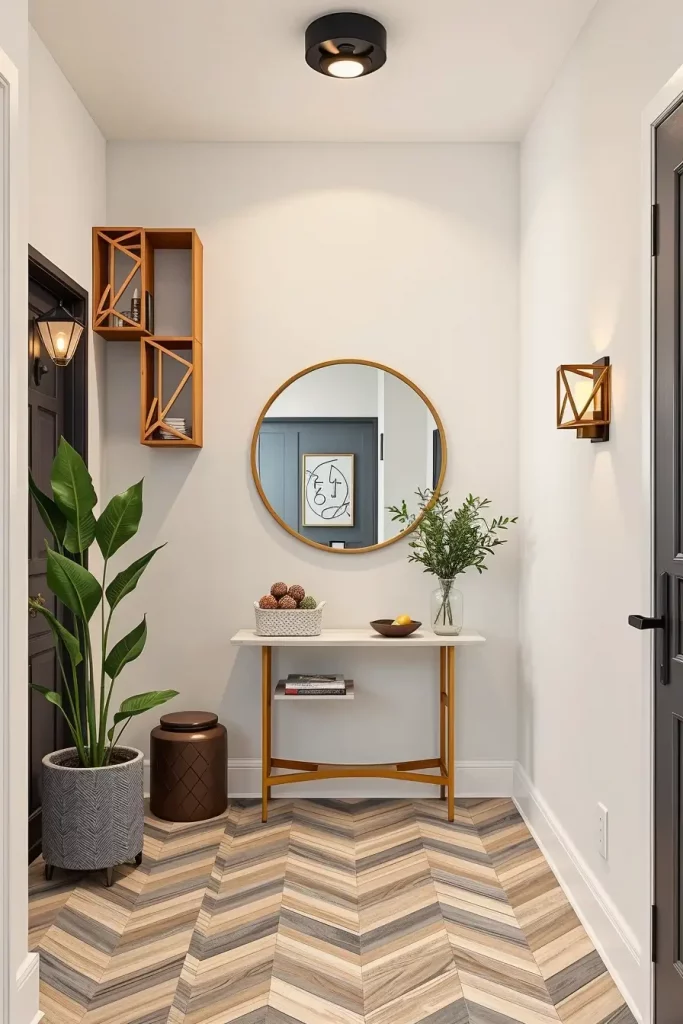 Those interested in modern design can use different shapes in geometric patterns in their small entryway for both balance and pizzazz. I usually set up angular wall shelving, use round mirrors or put up hexagonal tiles to interrupt the straight lines of the hallway. They bring energy to the layout and help it not look plain.