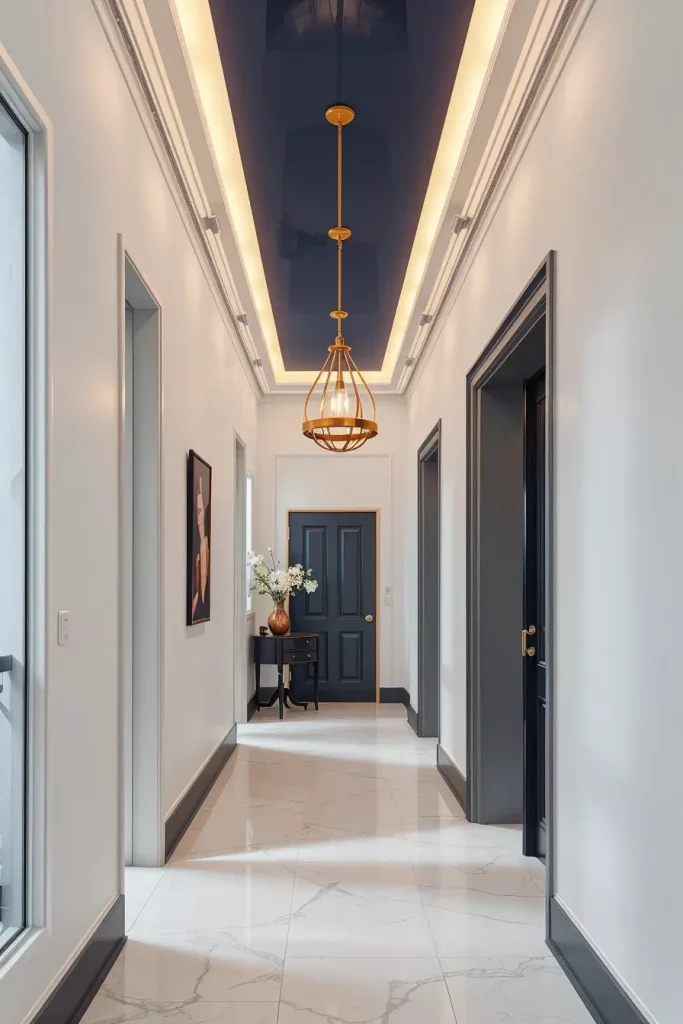 I generally select rich jewel tones, but white or taupe gloss is just as impressive. A high-gloss surface here makes it look like an architectural feature when set with other matte surfaces in the hall. Reflectors are very useful for brightening hallways that do not have much light.