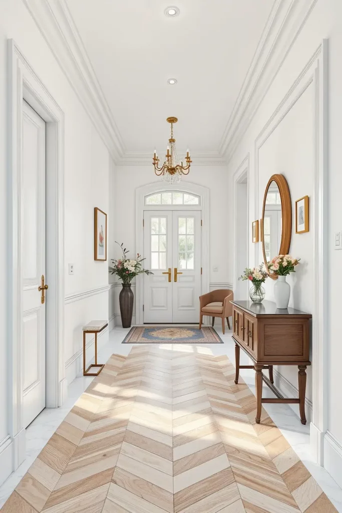 A simple way to be practical is to set up a narrow shoe rack or add an interesting inlaid mat near the entrance, so the floor’s design stays visible.
