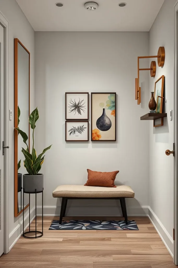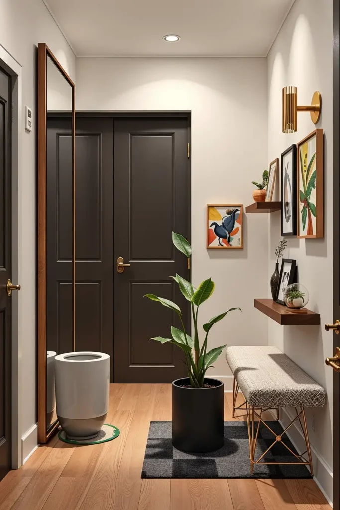 During my design phase, I could add a slim vertical mirror on one wall and put a sleek bench under a grouping of little floating shelves on the other side. Adding a tall snake plant in a slim planter helps to bring life and height to that corner. Meanwhile, if you have wall space available, a sconce like an angled brass fixture will give you drama and light without crowding your floor.