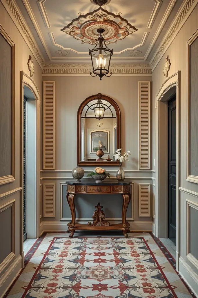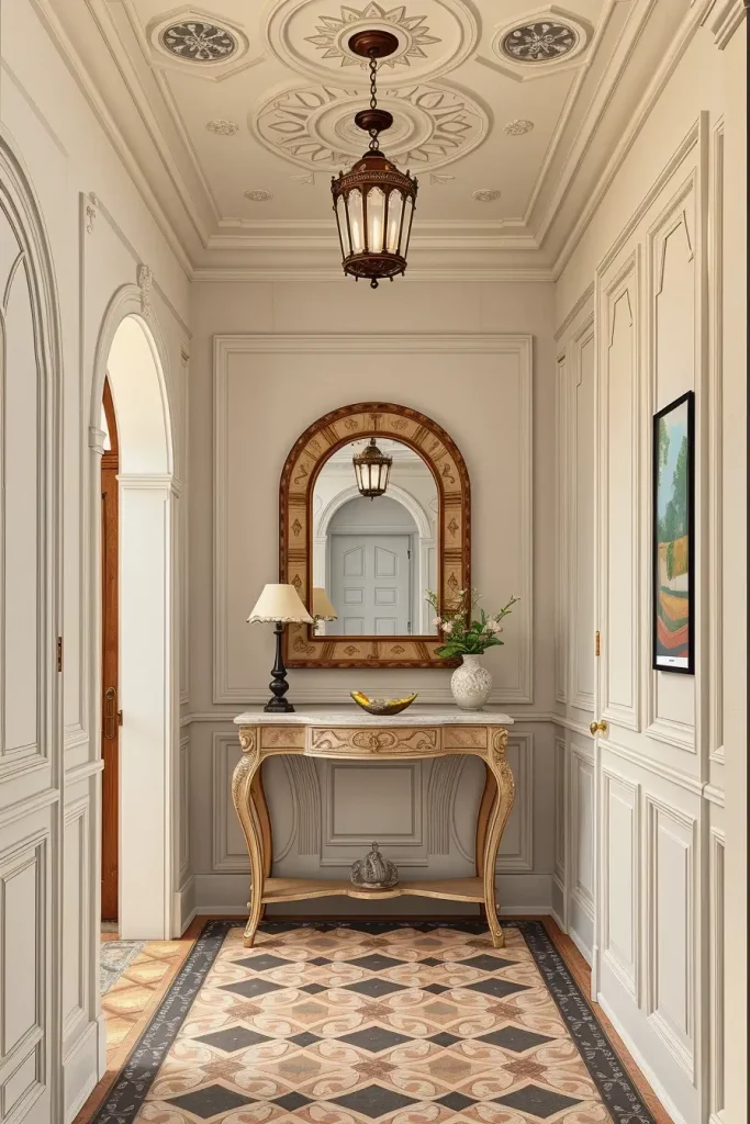 One way I like to add a little bit of architectural style is with a fluted console table, ribbed panels on walls or an arched mirror in the doorway. The ceiling medallion, along with a boldly designed ceiling light, emphasizes height in the room, while patterned horizontal tile tiles resemble the strong aesthetic of oversized area rugs. Even with a single style of wall trim—pilasters—you can add both order and a touch of class.