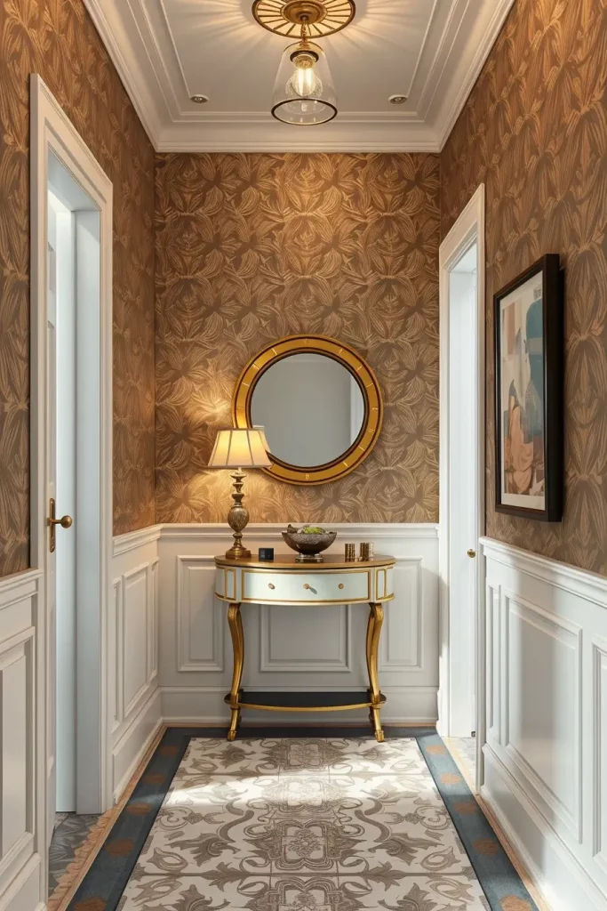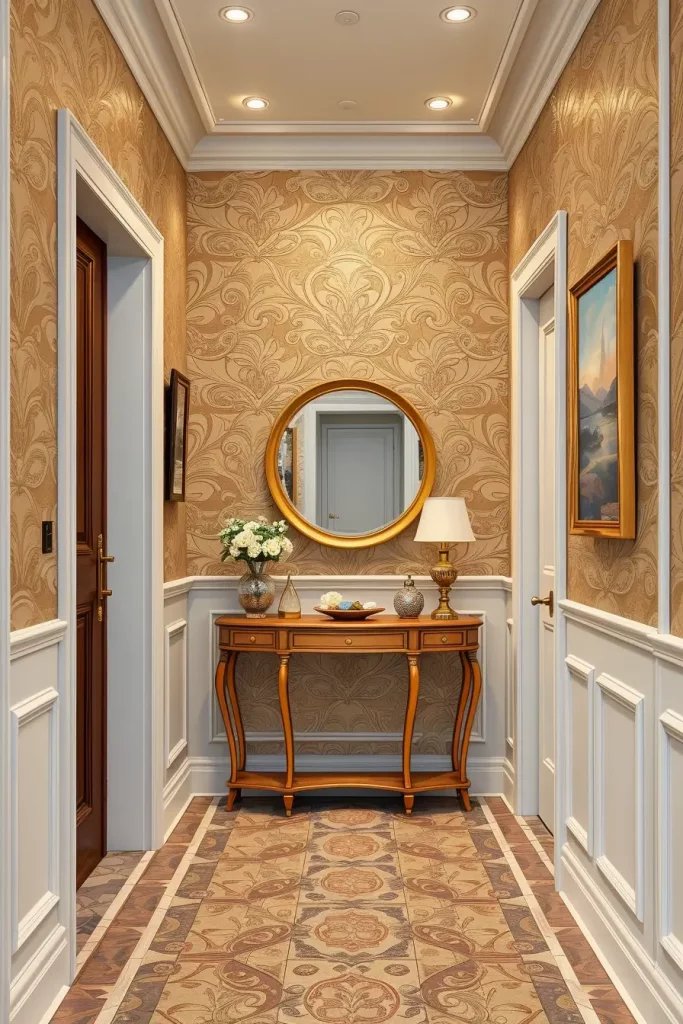 I find that brass and gold are a wonderful way to add style to a small entrance hall without making it look crowded. Using metallic colors makes a room bright, cozy and seem more opulent. Brass frames, gold coat hooks or a bit of gold trim on your furniture are all you should add—few well-chosen touches will matter most.