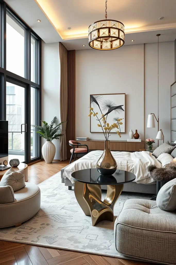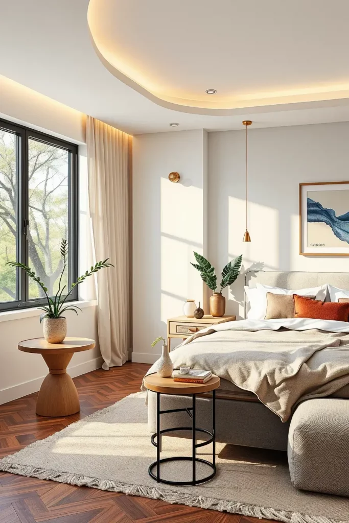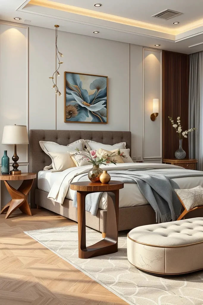 I apply Sculptural accent table where the bedroom layout requires a point of attention but which is rather artistic and practical. In interior design of 2026, organic shapes in these tables commonly represent turned-line headboards or architecture.