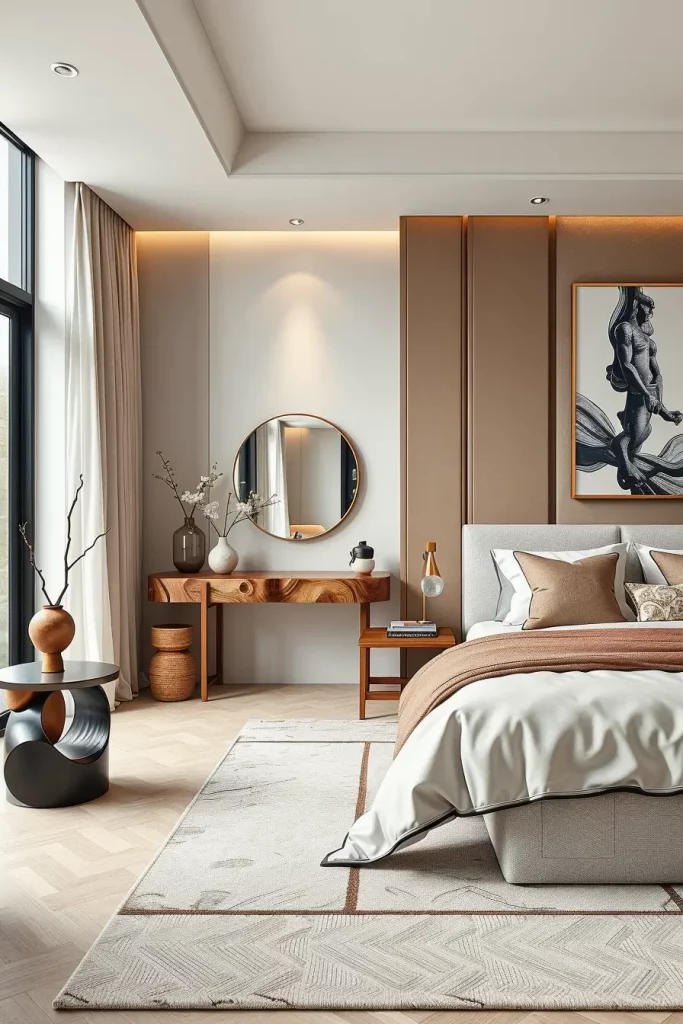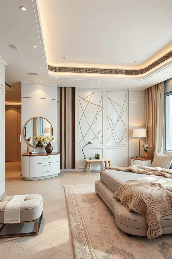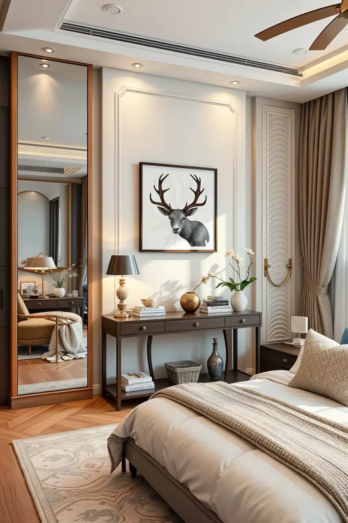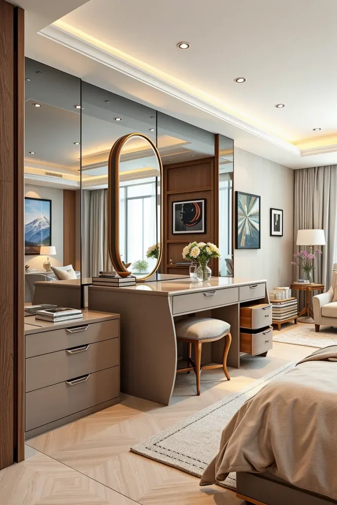 What I would include here is more emphasis on the integration of mirrors, particularly on the softly rounded mirror, wall-mounted ones, which would fill out the dressing area and enhance the appearance of a modern bedroom.