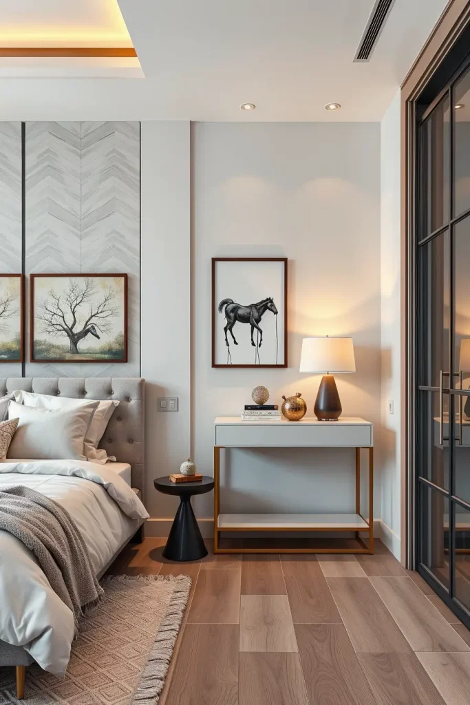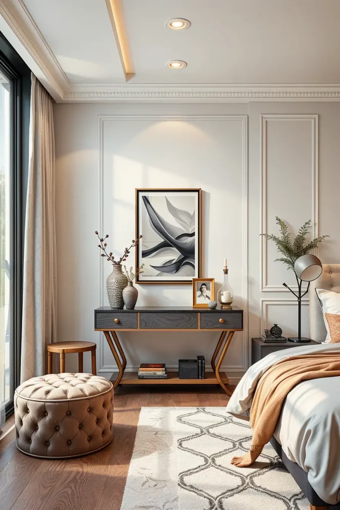 One of the design components in 2026 to consider is a Console Table in the bedroom. I tend to apply it to the areas of transition like in the background of a bed, a wall, or window. This is because of its shallow depth that enables it to augment aesthetics without wasting up on space.