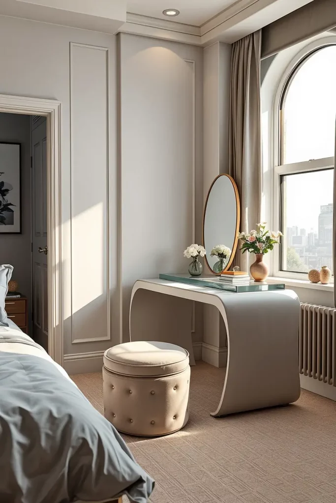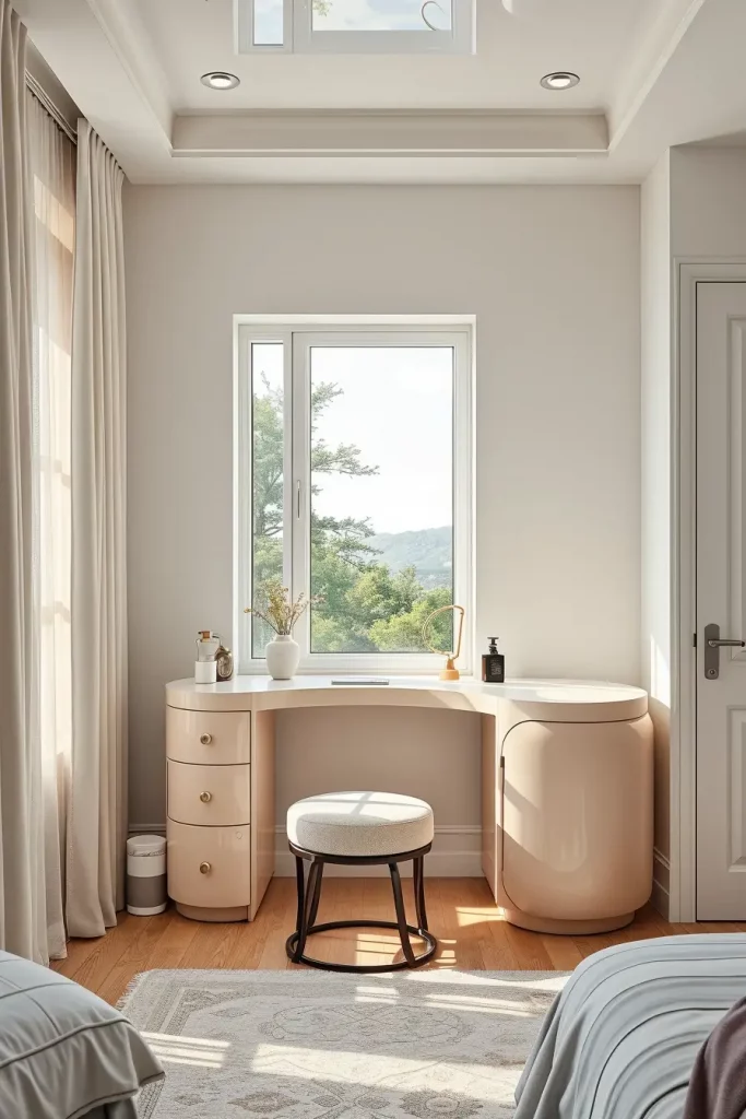 I usually combine a Makeup table, a gently rounded silhouette, a slick mirror, and subtle shelving in my project. Even the wood veneer or matte lacquer assist the table to blend in with the bedroom color scheme whereas a similar stool or a slender chair would be comfortable but not too bulky to the eye.