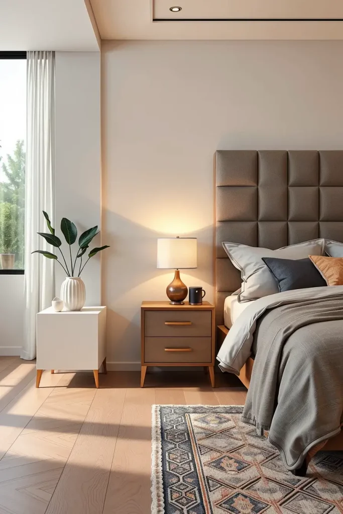 Minimalist side tables are also one of the options that I use instead of traditional nightstands. Such materials as light wood, stone composite, or matte metal bring about a sophisticated impression. Round side table or Square side table is good according to the room design and matching with the furniture.