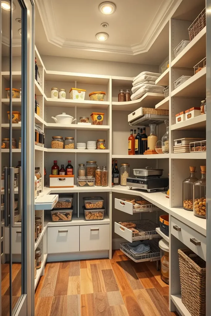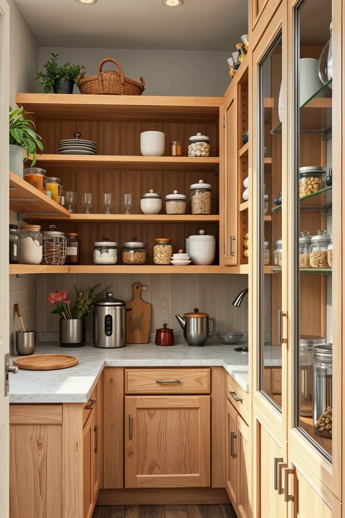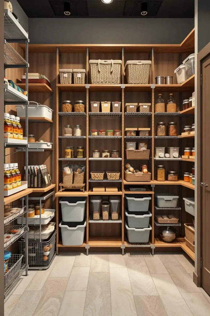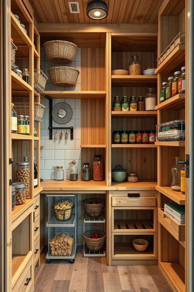 When it comes to this type of a pantry, I would use bamboo shelves, metal baskets recycled, and glass storage containers since they have longer lifespan and enhance the design. Open shelving will keep everything in sight, whereas adjustable wall systems will enable homeowners to change their storage with the evolving needs. I usually add a slim pull out unit or wall mounted spice racks so that there is no overcrowding in the main shelves. All these factors are combined to produce an effective and clean organization structure that is functional and does not compromise on style.