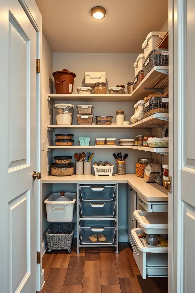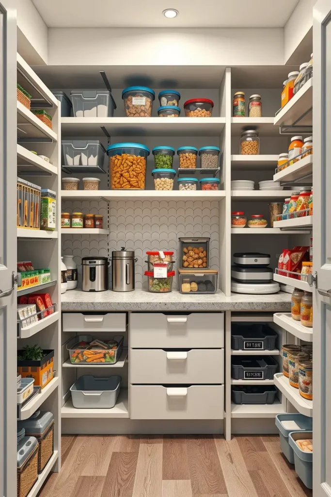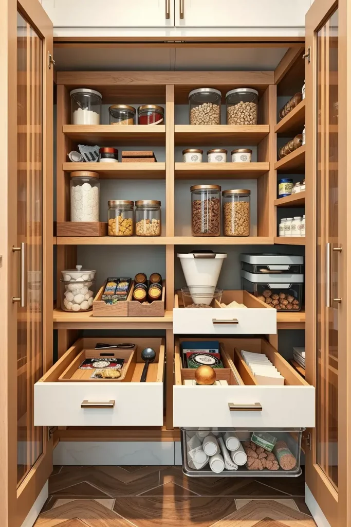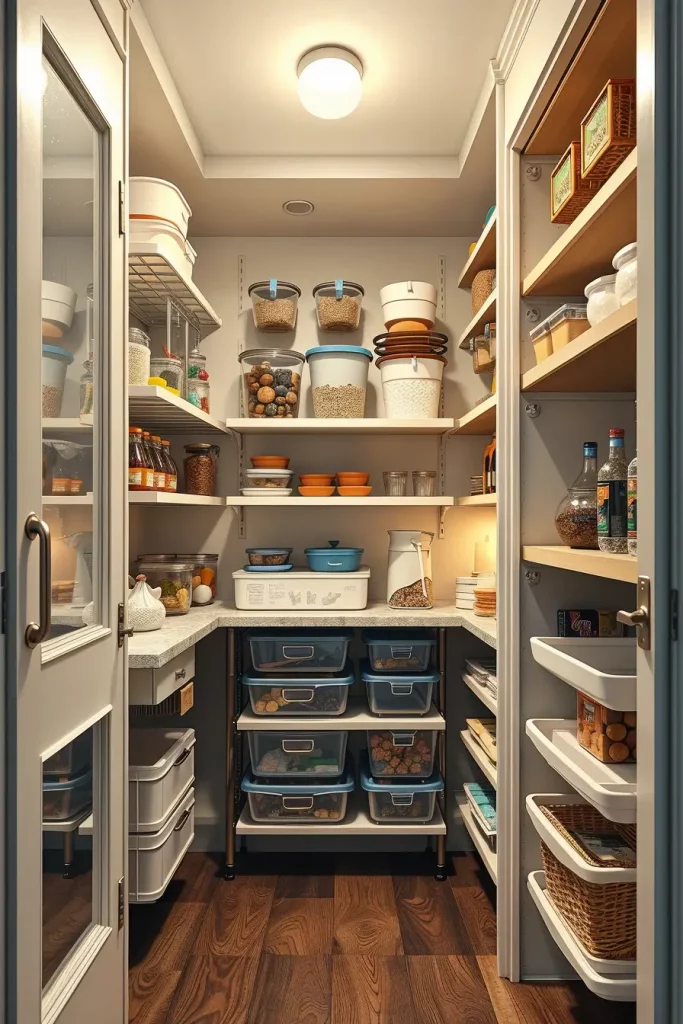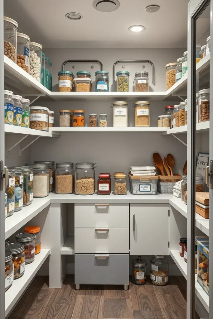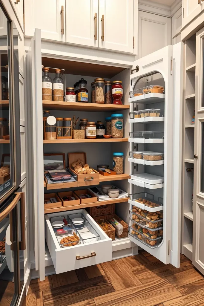 I add transparent containers, movable shelves, snacks or grains trunks, and shallow drawers where utensils are located in aid of cooking activities. I also use pantry compartments comprising of adjacent countertops to ensure that the ingredients are just at arms-length of one. This saves time on hunting down things and makes the kitchen run well.