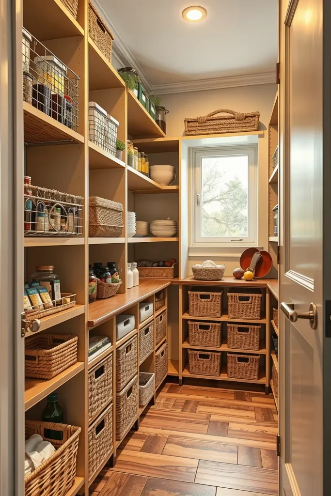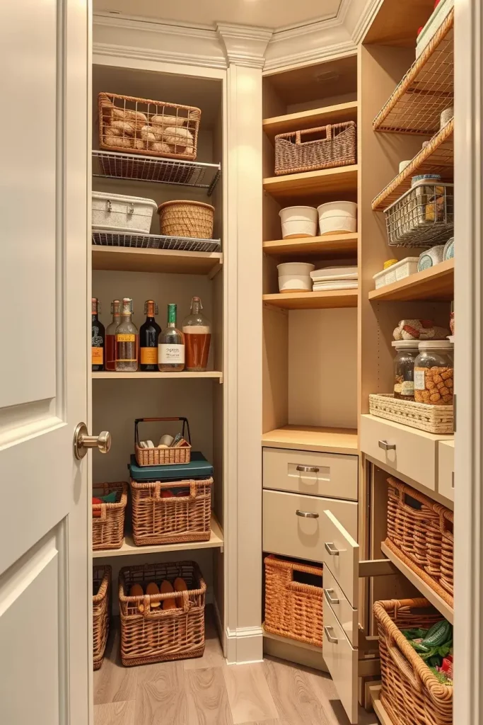I usually use wire baskets, woven bins, and metal-framed pull out baskets which are attached beneath shelves. Quick visibility is achieved through wire styles that add no weight to the design whereas woven material is warm and brings some kind of visual weight to the design. Drawers with pull-out baskets are particularly convenient in the produce, snack, or cleaning supplies since they can be stretched out entirely and eliminate the necessity to go deep into the shelves. Similar finishes assist in integrating the system, be it the pantry leans modern, warm or minimalist.