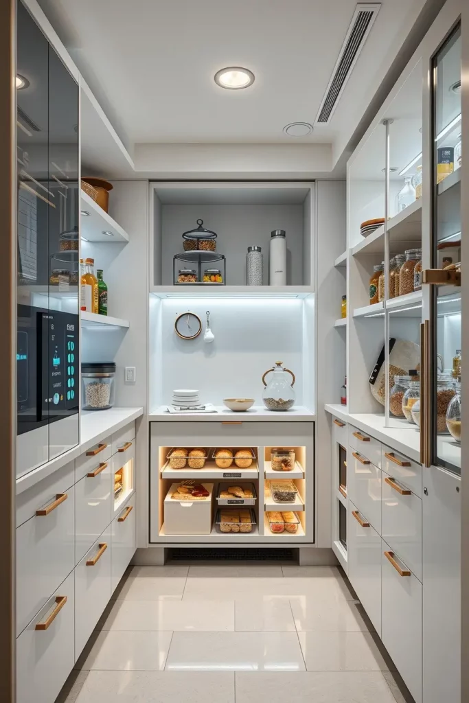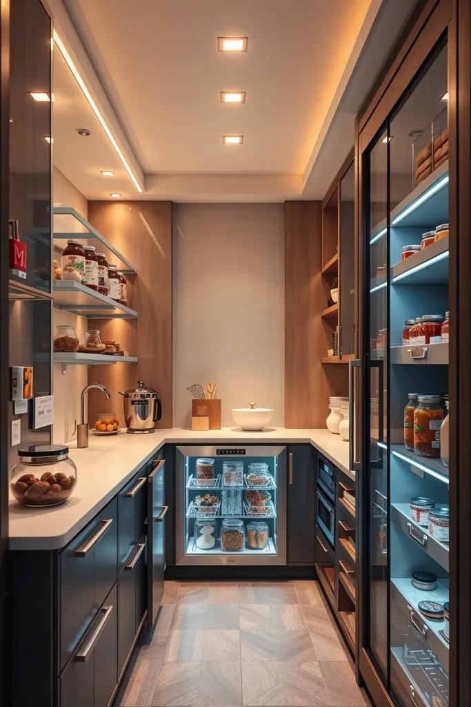 Most of the features I will usually incorporate are smart labels, temperature-controlled mini-drawers, or an integrated shelf lighting with programmable features. These factors occupy less space on the ground, but will significantly enhance ease of access and organization. Smart canisters that alert you when you are out of necessities are also useful in small rooms with pantries that you need to be organized.