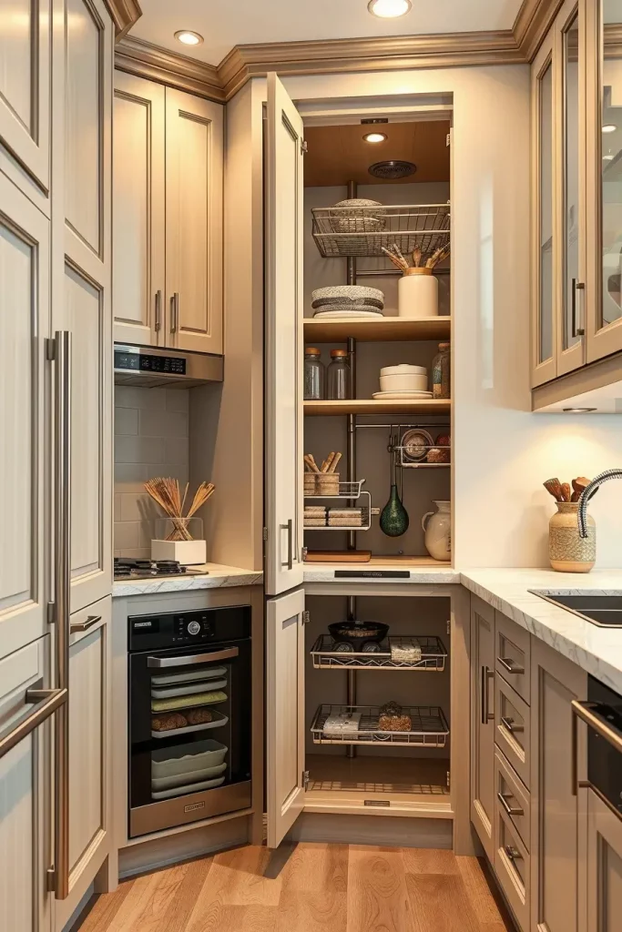 Personally, there is no place like having corner pantries in order to enhance organization within small kitchens. Several American design gurus point to inbuilt storage being able to make the most of even a small space (up to 40 percent more usable when angled) and this has been evidenced in my own experience on numerous occasions. The trick is to design the corner in a manner where accessibility is promoted and avoid dark and inaccessible corners as was characteristic of an older kitchen corner. These limitations are no longer there with the solutions of today.