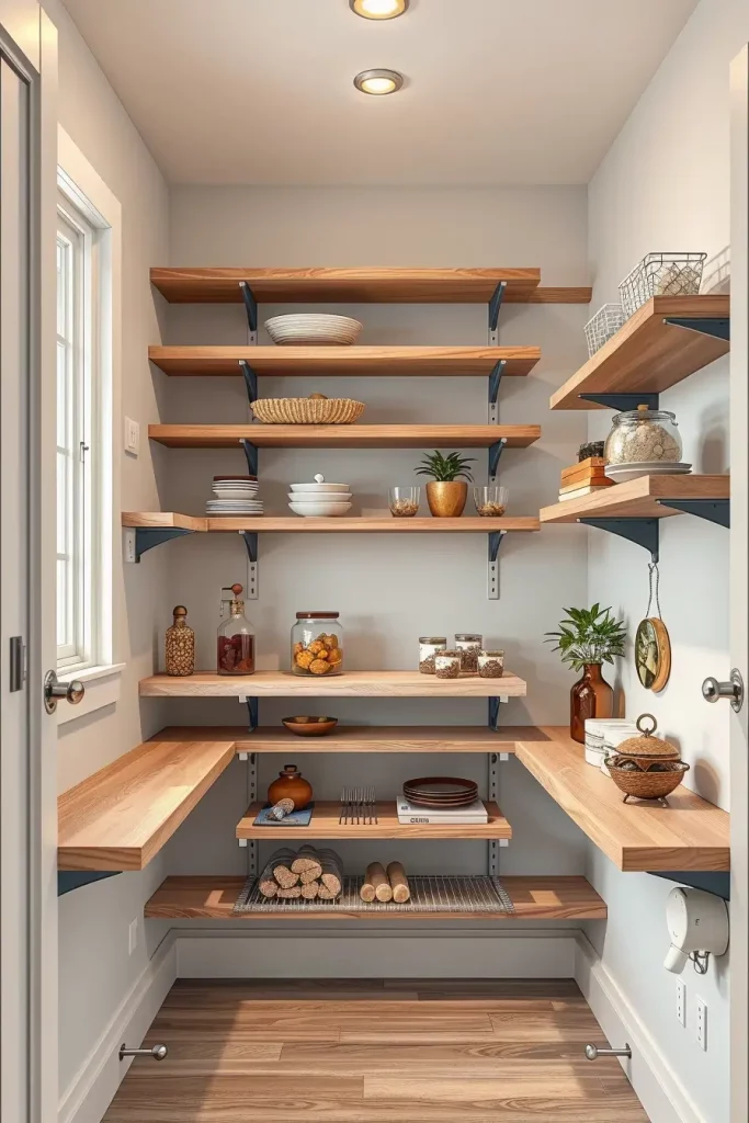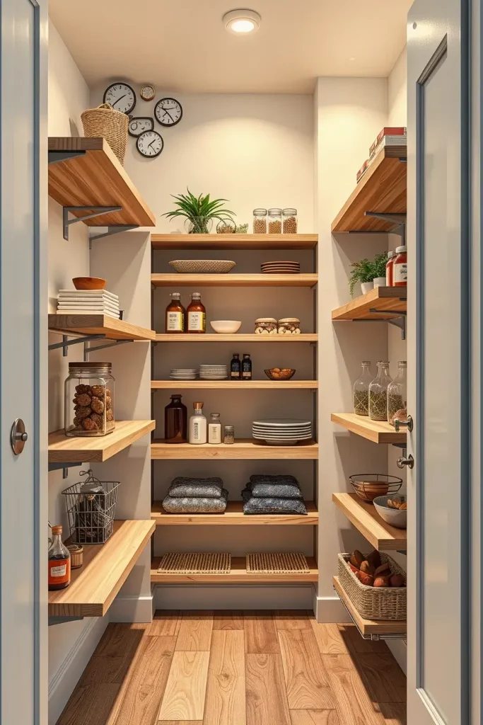 Floating shelves also provide a great way to achieve the effect of spaciousness within the small pantry styles. In case I apply using floating shelving systems, I concentrate on providing the pantry with an open appearance without losing structural stability. They enable the room to feel less enclosed and enhance accessibility of objects stored.