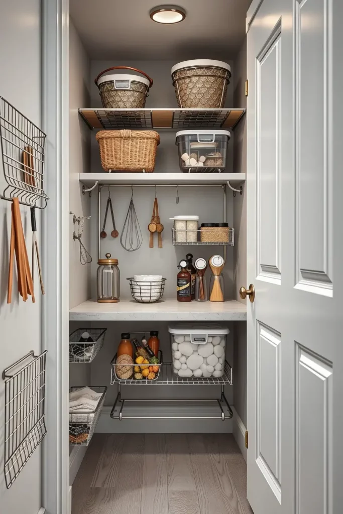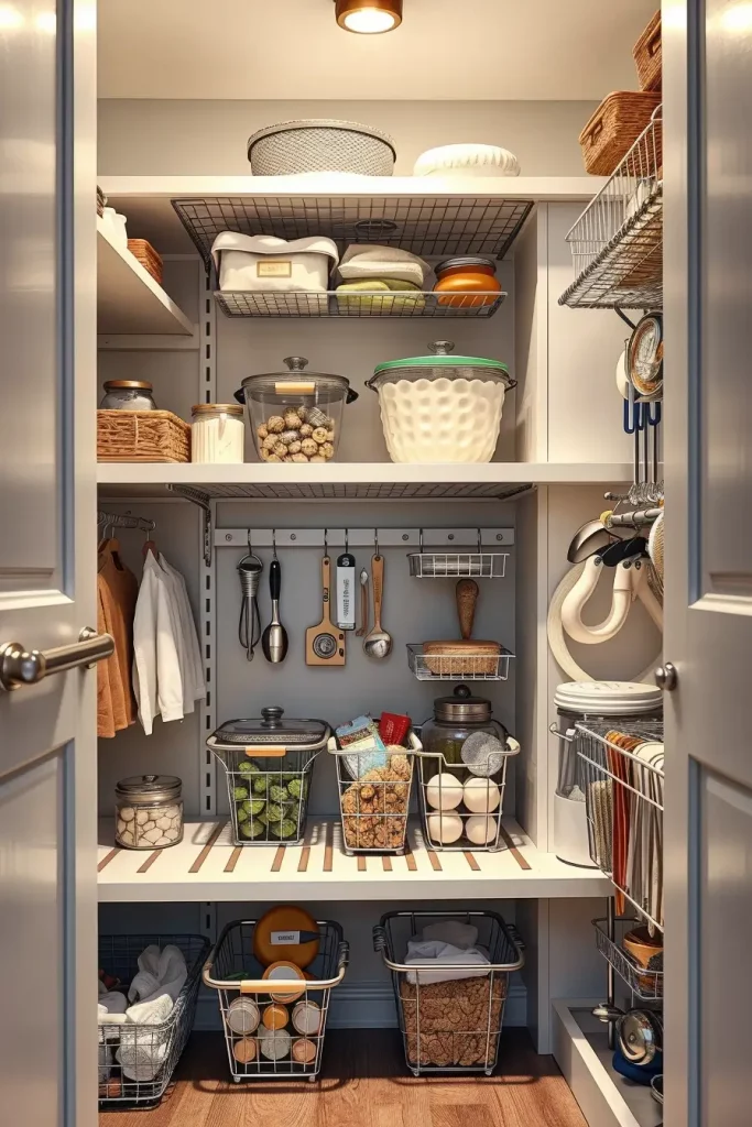 I tend to add wire baskets, hanging racks, or shallow sliding drawers under shelves since they only occupy the organizational second layer, but not additional square space. These accessories can be used to keep spices, little jars, snacks or linens. Their positioning also enables the huge shelving surfaces to be occupied by larger products like appliances or bulk products.