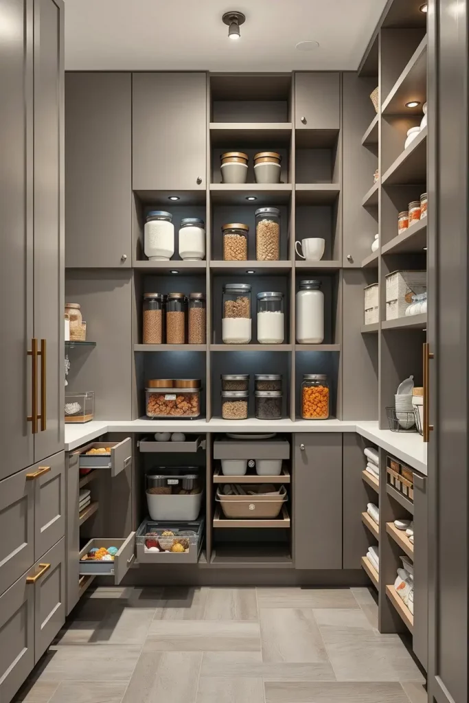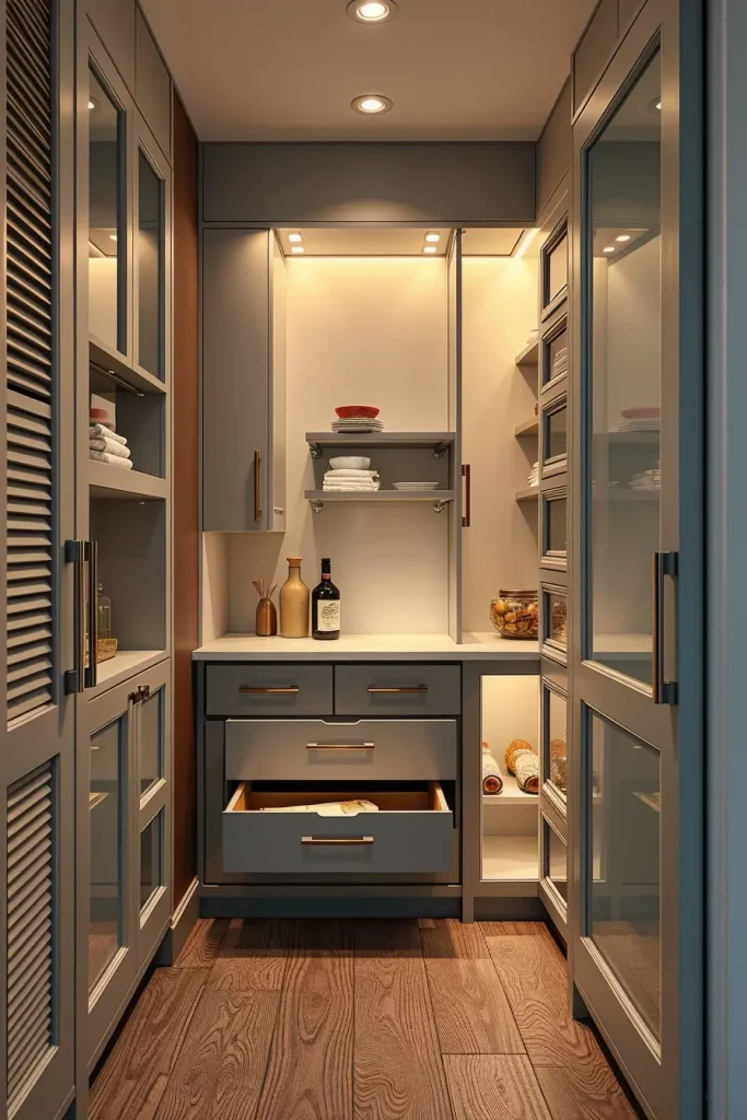 No item of such a pantry is chosen due to chance. I am used to installing adjustable shelves on one of the walls to suit the different size of containers, where I have a thin cabinet or pull-out rack which is used to keep the spices and snacks. The use of uniform materials like matte laminates, light wood or built-ins that are combined with metal can create cohesiveness. The use of soft-close systems also minimizes noise levels and the presence of integrated lighting under shelves makes sure that the items are visible all the time. Integrated hooks or skinny baskets have also become unexpectedly convenient without taking up too much shelf to essential space.