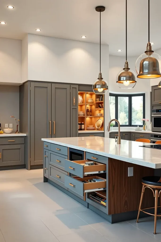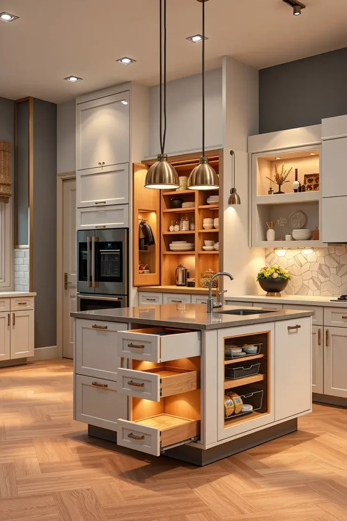 Some of the things I usually encompass in the base of the island are pull out drawers, rotating corner storage or slim vertical compartments. These characteristics provide easy accessibility in the cooking area and bring the pantry items near at hand. I occasionally add separate spices or baking supplies or small appliances areas depending on the size of the island.