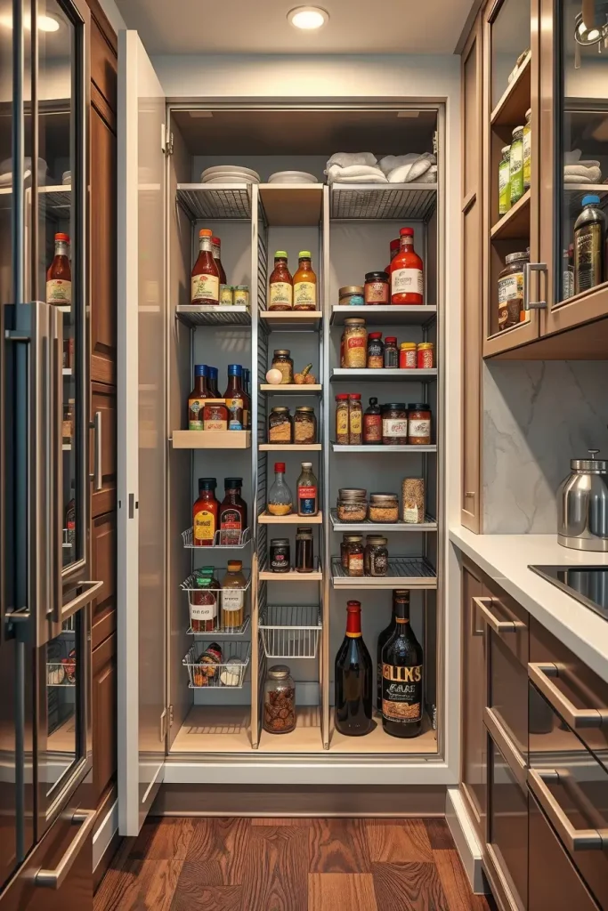 I suppose certain items I included that would help me facilitate this system would be tall adjustable shelves, rail-based storage of commonly used products, slim ladders or step stools, which would easily fit away in the corner. The structure is made to be strong by using materials like metal or high density composites, which does not make the structure appear heavy. Another thing that I do frequently is adding vertical dividers to the trays and cutting boards as these objects are much more available when stored in an upright position.